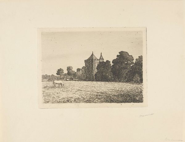 This print of Slot Assumburg was made by jonkheer Barthold Willem Floris van Riemsdijk using etching, a printmaking technique with a long history. The process begins by coating a metal plate with a waxy, acid-resistant substance called a ground. The artist then draws through this ground with a needle, exposing the metal beneath. When the plate is immersed in acid, the exposed lines are “bitten,” creating grooves. Ink is then applied to the plate, filling these grooves, and the surface is wiped clean. Finally, paper is pressed against the plate, transferring the ink and creating the print. The beauty of etching lies in its capacity for fine detail and subtle tonal variations. Look closely, and you’ll see how van Riemsdijk used these qualities to render the architecture of the castle. There’s a delicate balance between control and chance in the etching process, and in the hands of a skilled printmaker, like van Riemsdijk, these nuances become integral to the work's aesthetic impact. It’s this combination of material, technique, and artistic vision that makes this print so compelling.