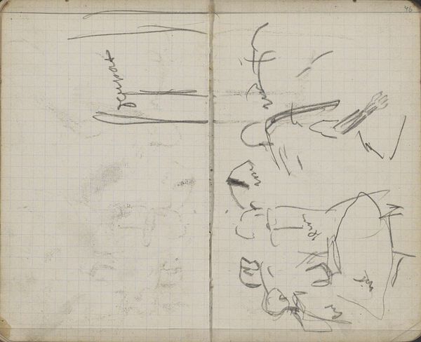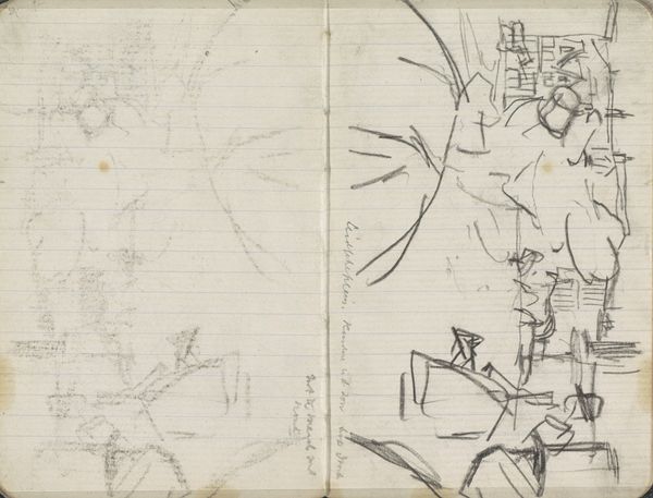 Curator: Looking at this pencil drawing from around 1898-1902 by George Hendrik Breitner, "Gezicht op de Westerkerk in Amsterdam", I immediately feel a sense of urgency and spontaneity, almost as if the artist was trying to capture a fleeting moment in time. What is your initial impression? Editor: The first thing I notice is the clear contrast between the built form and the medium itself. I think the lined paper of this sketchbook drawing lays bare the physical support on which the scene emerges—quite literally revealing the conditions for art making itself. Curator: Absolutely! It feels so raw and unfiltered. The loose lines really bring the subject to life. You can almost imagine the bustle of the city around the church, can't you? I am amazed by his efficient strokes! It's as if he condensed a grand vista into just a few, masterful flicks of the wrist. Editor: Right, but I wonder, does the choice of such accessible materials affect our perception? Pencil on paper brings with it associations with study, rehearsal, or even the everyday practice of note-taking. How do these "humble" materials inform how we appreciate what may have been conceived of as a monumental subject, given his vantage point on Amsterdam? Curator: It humanizes it, in my opinion! He’s making the Westerkerk his own; not just a religious site, but a monument observed by him, drawn in the medium that allowed for personal, reflective interaction with a space, if that makes sense? Editor: Sure! The materiality speaks to that immediacy, absolutely. This drawing seems to question, what is lost and what is gained in that kind of exchange? The paper looks almost ephemeral. It encourages us to confront how we look at both history and something as ever-present as the Westerkerk, while suggesting their potential to fade away or transform. Curator: Breitner manages to turn an apparently basic sketch into an impression so personal and potent! Seeing this piece really emphasizes the impact of perspective in art and in our memory of spaces that form part of our identity. Editor: Yes, Breitner turns the drawing into an introspective study, prompting us to consider the physical processes behind representations and cultural monuments in art and society at large.