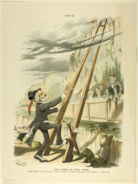Editor: Here we have "Sport on the Lots," from the Snapshots from "Puck" series, created around 1888 by W. Duke, Sons & Co. It’s a color print that presents a rather peculiar scene with caricatured figures. I'm immediately struck by the odd blending of humans and animals – what's your interpretation of this piece? Curator: This lithograph offers us a window into the anxieties and humor of late 19th-century America, particularly regarding class and immigration. Consider how the Irish brogue is rendered phonetically in the caption: "Fwhat are yer doin' Jerry?". This caricature, while humorous, leans heavily into ethnic stereotypes, depicting Irish immigrants as rural, foolish, and perhaps even bestial. Notice how their bodies are literally fused with goats. What commentary might the artist be making about belonging, or perhaps, exclusion? Editor: So, the humor is actually… exclusionary? The physical merging of man and animal suggests a loss of identity, or perhaps a statement on how these immigrants were viewed by dominant social groups? Curator: Exactly. And it was used as a promotional item by a tobacco company. That context is crucial, isn't it? The print, seemingly innocuous, is actively shaping and reinforcing societal prejudices to sell its product. The stereotypes become normalized, and the systemic inequality, justified. What does this say about art's role in propagating such biases? Editor: It's unsettling to realize something seemingly light-hearted could be complicit in deeper social issues. I always thought of art from this period as simple and quaint, but I now see there are underlying narratives I was missing. Curator: Precisely. By interrogating art like this, by digging beneath the surface, we uncover the complex relationships between art, power, and identity. Editor: I'll certainly look at these types of works with a more critical eye moving forward. Thank you!
