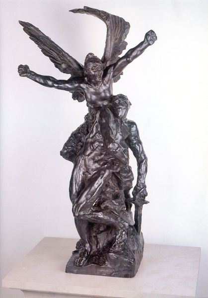 Curator: Standing before us is Giacomo Manzu's "Bozzetto per Donna seduta," a bronze sculpture rendering a seated woman. Editor: Oh, she looks… uncomfortable? Almost like she's made of crumpled paper. Curator: Indeed. The rough texture is quite pronounced, departing from traditional idealized forms. Note how Manzu uses fragmented planes to construct the figure. The interplay of light and shadow across the folds of the dress creates a dynamic visual experience. Editor: It feels very tactile. You just want to reach out and smooth down those wrinkles, give her a more polished look. But that tension between smooth and rough… it makes it kind of poetic, actually. Like the weight of experience etched onto the bronze. Curator: Precisely. The contrapposto stance, albeit subtly suggested, provides a sense of balance and latent movement, a very slight counter-positioning of the shoulders and hips. It’s a formal device found in classical sculpture but used here to emphasize an almost internal sense of restraint. Editor: Restraint, yes! She's holding onto something. And the fact that it's a sketch, "Bozzetto," a maquette – that adds another layer. Like we’re catching a glimpse of an idea in its raw form, still evolving, still a bit messy. I think that’s lovely, it’s genuine. Curator: Consider, also, the material transformation itself. Bronze, often associated with permanence and monumentality, is here used to capture a sense of ephemerality and provisionality inherent in a "bozzetto." It plays with our expectations of sculptural representation. Editor: So, it's almost a contradiction, isn’t it? A solid form conveying this feeling of… incompleteness. That's what grabs you. Like there’s more to the story, just beyond what we can see. Curator: Absolutely, and by investigating its very nature we also come to investigate the artist. This work exemplifies a departure from the static tradition. It represents movement toward something vital. Editor: It's the vulnerability of a quick study, preserved in enduring metal. It's gorgeous, actually. Thanks for pointing that out.