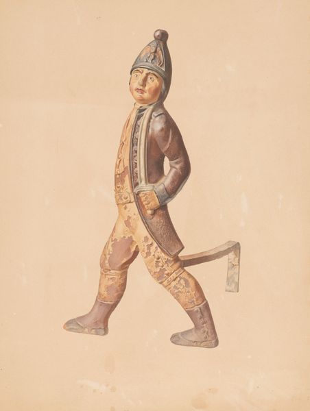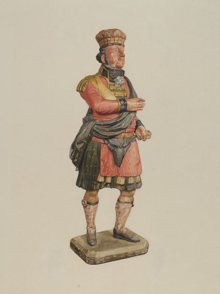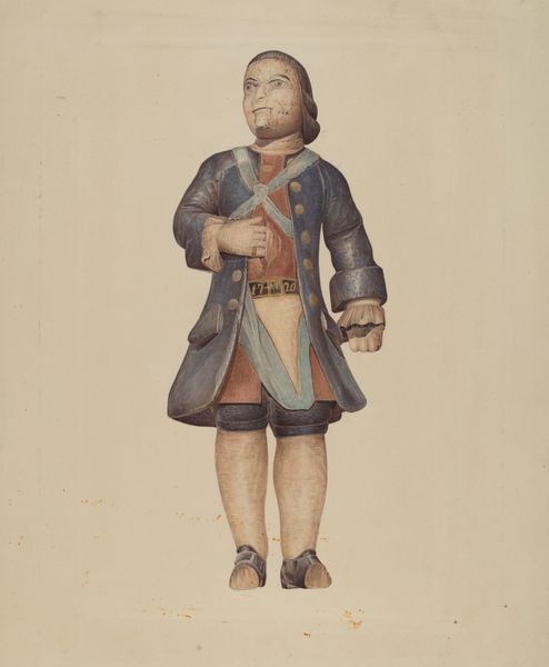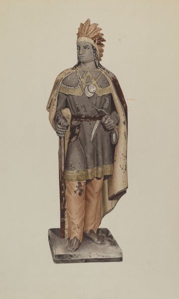 Editor: This is Henry Murphy’s "Cigar Store Indian," painted around 1940, using watercolors, oils, and possibly charcoal. I find the image simultaneously dignified and...unsettling, given the context it implies. What's your interpretation? Curator: That's a very perceptive reaction. The history of these "Cigar Store Indians" is fraught with appropriation and misrepresentation. Consider how these figures, initially intended as markers of commerce, evolved into stereotypes that reinforced a dominant, colonial narrative. What does it mean to see Indigenous people reduced to emblems of a specific industry, divorced from their complex cultures and histories? Editor: So, the very existence of these figures perpetuates a harmful narrative? Curator: Precisely. It's essential to interrogate the power dynamics at play. Who gets to represent whom, and to what end? How does this representation impact Indigenous identity and lived experience? This image isn’t simply a portrait; it's a loaded symbol within a larger framework of cultural appropriation. Can we separate its artistic qualities from this historical burden? Editor: It seems impossible to ignore that baggage. It changes how one sees the colors, the detail... even the artist’s intention. Curator: Indeed. This image invites us to consider how art can both reflect and perpetuate societal biases. What responsibilities do artists have in engaging with sensitive subject matter? Editor: This has given me a lot to think about, particularly the intersection of art, representation, and social justice. Curator: Me too. Hopefully, it inspires deeper conversations about the complexities of our shared histories and the role art plays in shaping them.
