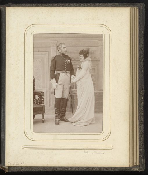 Editor: Here we have an albumen print dating from sometime between 1870 and 1880, titled "Portrait of William III and Princess Emma of Waldeck-Pyrmont." It gives me an immediate sense of the social expectations placed upon royalty, this posed formality... What can we read from this image in a historical context? Curator: This piece is fascinating precisely because of that formality. The stiffness is palpable, isn't it? We must remember that royal marriages were often strategic alliances. Emma of Waldeck-Pyrmont was William III's second wife, and significantly younger. How does the composition reflect the power dynamics at play here, between age and gender in late 19th-century European royalty? Editor: Well, Emma is slightly forward, yet she has her hand on William's arm, and William has his hand in his pocket, his left side presented towards the viewer. They both gaze forwards serenely. Perhaps to illustrate some new harmony and future heirs for the Netherlands? Curator: Exactly. Their serene expressions speak more to the projected image of stability and dynastic continuation rather than, perhaps, to the realities of a complex marriage within the rigid power structures of the time. Consider, too, the societal pressures on royal women specifically - their primary role to secure the lineage. Does that add another layer to how we interpret Emma's presentation here? Editor: It definitely does. The photo suddenly seems less about them as individuals and more about the institution they represent. It is a complex situation, but as such also deeply rooted in history and culture, just fascinating to ponder. Curator: Indeed. And by examining the context, considering questions of power, gender, and societal expectations, we gain a richer understanding of both the artwork and the era it reflects. There is a strong contrast present if one digs deeper into the subject matter.