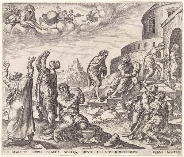 Editor: This is Theodoor van Thulden's "Odysseus cremating the body of Elpenor," made around 1632. It's a detailed print. It’s fascinating how much the scene conveys a sense of somber ritual, even without color. How do you interpret the significance of cremation in this depiction? Curator: Cremation, as depicted here, transcends the mere disposal of a body. It’s about transformation. Fire, in many cultures, is a powerful agent, isn't it? It purifies, it elevates. What do you see in the expressions of those gathered? Editor: They seem to range from sorrow to almost… stoicism? I guess that makes sense for a group of warriors. Curator: Exactly. Note the detailed rendering of their faces; Van Thulden uses those varied expressions to reflect not just grief, but perhaps also a collective responsibility. Elpenor's death, however accidental, demands this ritual act of respect. It connects them. Do you notice the recurring motifs of armor and shields nearby? What significance might they hold beyond just props of the scene? Editor: I guess it highlights how life and death were entwined with the duties of a soldier… and maybe suggests how even in death, there's still honour among warriors? Curator: Precisely! Think also about the larger epic of Odysseus. Each symbol here reflects an individual tragedy but is interwoven into the broader tapestry of fate, memory, and legacy. Seeing the scene presented as print almost brings a permanence, allowing this ritual of remembrance to continuously persist. Editor: It makes me consider how we memorialize events, or people even today, the rituals we partake in to carry those meanings forward. Thanks, that really illuminated this print for me. Curator: And you, brought fresh insight! It reminds us how symbols evolve, carrying cultural memory across time.