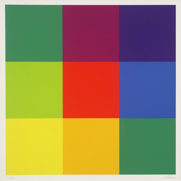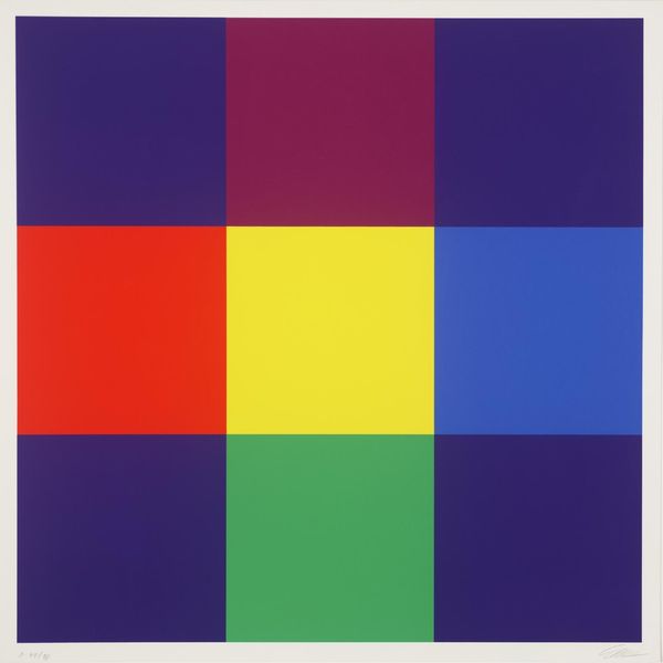 Editor: Here we have Max Bill's "Untitled" from 1974, rendered in acrylic paint. I find the sharp geometric shapes strangely soothing, like a visual puzzle. What do you make of it? Curator: The square, tilted to a diamond, immediately resonates with alchemical symbols – the squaring of the circle, perhaps? It’s as if Bill is presenting us with a formula, an equation visualized in colour. Editor: An equation? That's a compelling way to look at it! The colors feel almost mathematically precise too, not emotionally expressive in the way Abstract Expressionism can be. Curator: Precisely! The 'hard edge' quality strips away subjective expression, inviting us instead to contemplate the pure relationships between the colors themselves. Think about how colour associations shape us from childhood – do these choices subvert those expectations? Editor: The unexpected lilac feels key! It's not a color I immediately associate with geometry or hard-edged art. How interesting that it disrupts my understanding. Curator: Exactly. Lilac can symbolize everything from royalty to spring, altering depending on context and culture. Its placement within this rigidly geometric framework introduces tension, pushing us to consider multiple meanings simultaneously. How do *you* now perceive the composition's mood? Editor: Now, noticing that lilac, I feel less of a clinical sense, more a whisper of playful rebellion against pure form. It softens the composition, perhaps. Curator: Indeed! It's this dance between rigor and nuance that makes Bill's work so enduring. Editor: It’s amazing how understanding the symbolism at play can alter one’s experience of an abstract piece. I'll certainly think more about those hidden meanings! Curator: And I appreciate your point on the balance between form and color, it helps highlight the painting's visual dialogue and dynamism.