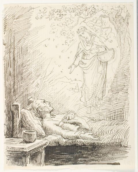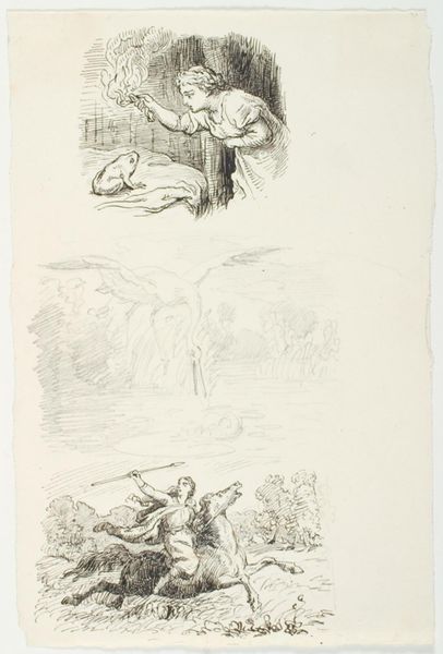 Lorenz Frølich's sketch for H.C. Andersen's "The Marsh King's Daughter" presents us with a scene steeped in transformation and primordial symbolism. Hovering above the nude figure of the daughter are swans, mythical creatures, carriers of souls and symbols of metamorphosis, dropping what appears to be snow flakes or eggs. This motif of a woman connected to swans echoes through history, from Leda and the Swan in Greek mythology, embodying themes of fate, and the intervention of divine or natural forces. The swan's association with purity and transformation is flipped; here, they are dropping the seed that will transform the daughter into something other. The daughter's raised hand suggests an acceptance of her fate, a kind of submission to the subconscious forces shaping her destiny. Consider the emotional weight of this transformation: the swan, a symbol of grace, contrasted with the unknown, potentially monstrous form. The image, with its stark contrasts, evokes a sense of primal fear and wonder, reminding us of the powerful, often unsettling nature of change and rebirth. The cyclical narrative of mythology reminds us that even in transformation, echoes of the past remain, resurfacing in new forms.