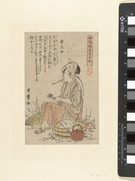 Curator: I am drawn to the palpable sense of intimacy in this print titled "Sympathy," a work created sometime between 1758 and 1778 by Suzuki Harunobu. The Met currently houses it. What are your first thoughts? Editor: An overwhelming melancholy. The muted colors—coral, pale blues—contribute to a quiet, almost mournful mood. There’s something beautifully somber about its restraint. Curator: Notice the composition. Harunobu has carefully arranged the figures, almost as though posed on a stage. We have a refined woman, seemingly lost in thought, her posture echoing a quiet grief. Down below, a young girl attends to a dog. Can you detect the symbolism? Editor: Dogs in art often stand for loyalty, yes? The young girl might be attempting to console the animal or is at its service, so perhaps this reinforces the idea of faithfulness in the face of the woman's sorrow. Also note that the workers carrying crops in the background are partially hidden by golden haze, reinforcing that the melancholy of the characters shown in the front is separate from everyday life. Curator: The haze you mention—it also suggests a blurring of the temporal boundaries, possibly alluding to themes of past memories intruding on the present. What do you make of her robes, draped so loosely about her? Editor: Well, the textiles themselves communicate status, naturally. However, beyond that, the loose draping reinforces her vulnerability and hints at an underlying fragility. These flowing garments might symbolize her shifting state of mind and her readiness to yield to overwhelming emotion. Curator: Ukiyo-e prints like these often reflected idealized notions of beauty and elegance, yet "Sympathy" feels deeply personal. Editor: Indeed, Harunobu manages to convey a complexity of emotions, moving beyond mere aesthetics. It’s a quiet exploration of sadness—a moment of stillness that truly lingers. Curator: Ultimately, "Sympathy" exemplifies how cultural visual language interacts with private emotions, creating an elegant moment for us to behold and contemplate.