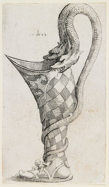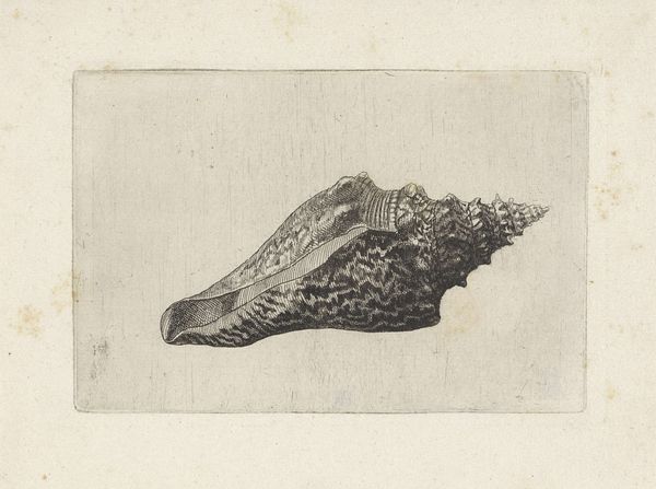 Curator: At first glance, it seems rather forbidding, doesn’t it? Editor: Indeed! Something almost monstrous about it. And that precision – what are we looking at exactly? Curator: This is Wenceslaus Hollar’s etching, "Shell (Murex brandaris)," created around 1645. Hollar, a prolific printmaker, was renowned for his detailed renderings of various subjects. Editor: A shell? Fascinating. Look at the material detail, the intense labor, I can almost feel the weight and texture just from those lines. The cross hatching must have taken quite some time. It is such a simple subject made so monumental by intense workmanship. What was Hollar getting at here? Curator: The popularity of detailed scientific illustration was really taking hold in the 17th century, fueling European fascination with the natural world. It was tied to emerging economic factors like increased global trade in scientific specimens, as well as an overall vogue for collecting. Hollar made several prints of shells, suggesting they were objects of considerable interest. Editor: Objects of status. Not only a record, but also a display of ownership. But I still keep thinking about the labour—the etching process, the press, the ink, all contributing to reproduce the shell in minute detail, it is quite impressive! Curator: It raises an interesting point about access, too. Prints like these made specimens, otherwise exclusive to collectors, available to a much wider audience, albeit within certain social spheres. And the imagery associated with shells wasn’t neutral. Editor: You're right, I wonder what meaning this object held during its creation? Curator: Well, we see shells in Dutch still life painting as symbols of transience and vanity, reminders of mortality… or indicators of wealth, depending on context. Editor: A commentary on time through a shell… I will certainly contemplate it differently now!