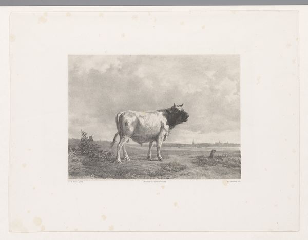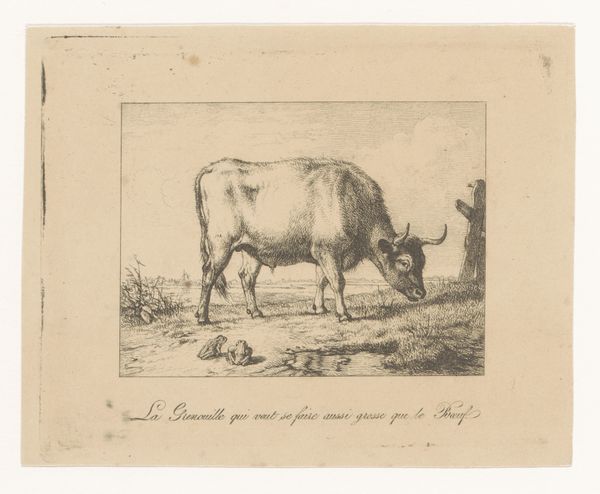 Curator: Right now, we're standing in front of Eugène Verboeckhoven's "Schaap in een weiland" created around 1828. It's a striking etching. The artwork is now housed here at the Rijksmuseum. Editor: It feels quiet, almost meditative, in a really subtle way. Just a sheep, simple composition, muted tones. It’s grounding. Curator: The pastoral setting lends itself to that tranquility. Think of sheep in art as gentle emblems—innocence, flock mentality, biblical references. In a lot of iconography, sheep symbolize followers and sheperds represent the spiritual leaders. What do you see here? Editor: It's not sentimental though, which I appreciate. There is that subtle reference, definitely, but it's really just *a* sheep. Verboeckhoven is just showcasing the animal form itself in this artwork; its wool, musculature, even its expression feel realistically observed, more than idealized. I can almost feel the texture of the wool through the lines of the etching. Curator: Absolutely. He had a reputation as an animalier, that's certain. He clearly knew his subject. Look closely at how he renders the animal's coat, it conveys so much with minimal lines. How does Verboeckhoven strike a chord, given these conventional artistic choices? Editor: I wonder if its allure comes from its understated quality. We’re used to these grandiose pastoral scenes; here, the sheep seems isolated. Alone on its little plot, surrounded by an empty paper frame. Almost feels existential? This lonely animal in an indifferent universe... Curator: That contrast is fascinating! The vastness of the meaning within the minimalist rendering of the sheep truly elevates it. Editor: In that sense, Verboeckhoven lets the mind fill in the context and find new paths for interpretation, perhaps more introspective ones. What started as a literal pastoral subject might just become an invitation for thought... Curator: Precisely. I believe that is where the timeless charm lies within it. Thank you for offering that perspective.