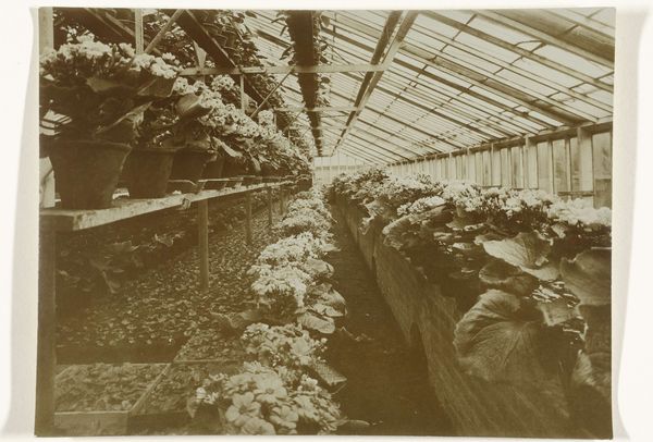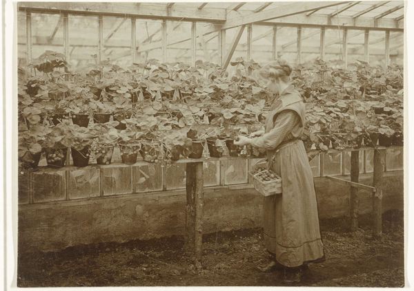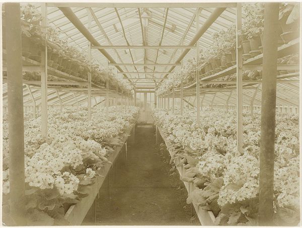 Richard Tepe captured this image of a greenhouse with strawberry plants, its date unknown. The photograph is dominated by the greenhouse's receding architecture, its structural lines converging towards a vanishing point that directs the gaze. This linear perspective creates a sense of depth and enclosure. The rows of strawberry plants, densely packed and spilling over their containers, introduce an organic contrast to the geometric regularity of the greenhouse frame. This contrast draws attention to how nature is contained and organized. The pale tonality and diffuse light soften the industrial aspects of the structure. Tepe’s composition raises questions about the relationship between nature and artifice, and the way that systems of order are imposed on the natural world. This interplay invites us to consider the cultural and philosophical implications of controlled environments and our manipulation of natural processes.