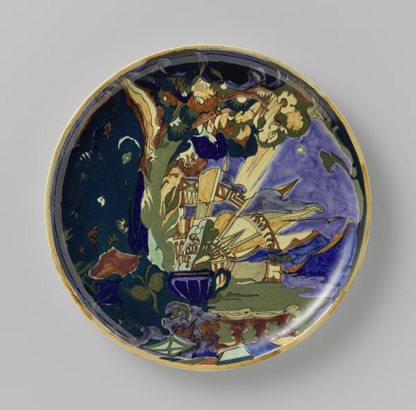 Editor: So, this is a plate, likely dating from between 1920 and 1922, made by N.V. Plateelbakkerij Ram. It is described as using mixed-media including ceramics and watercolor, which seems an odd combination. What is your take on this piece? Curator: Well, immediately, I'm drawn to the integration of what we often separate as 'high' art and craft, especially in the early 20th century. The fact that they’re using watercolor, a medium historically associated with fine art, on ceramics forces us to reconsider that hierarchy. Who was crafting these objects, and what was their training? Were they fine artists applying their skills to mass-produced goods? Editor: That is a fascinating question. The idea of the artist's labor becoming part of everyday life... but wouldn't watercolour be a rather unusual choice on ceramic, given its… fragility? Curator: Precisely! This leads us to consider the intended use and market for such pieces. Was this purely decorative, targeting a bourgeois consumer desiring "art" in their domestic space? The materials chosen dictate a certain use, or lack thereof. What does that tell us about early 20th century ideas of functionality, design and the role of art? Editor: So the very *choice* of these materials – watercolor and ceramic, seemingly at odds – speaks volumes about the object's purpose and the cultural values around art production at the time. Curator: Exactly. The piece isn't just *what* it is, but *how* and *why* it was made using those particular processes. It points towards consumption, labor, and the breaking down of artistic boundaries. Editor: That's given me a lot to think about, especially considering the materials themselves and how they reflect the broader context of art and industry during that period. Curator: Indeed, focusing on materials can unveil subtle narratives and open broader inquiries of any object, art or otherwise.