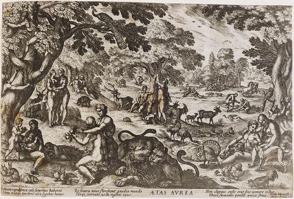 Editor: This is Antonio Tempesta's "The Age of Silver," made around 1600. It’s a busy scene, full of figures and animals engaged in what looks like everyday life. What strikes me is the sheer number of activities happening all at once. How do you interpret this work? Curator: Well, it's part of a series illustrating Ovid's *Metamorphoses*, reflecting on societal shifts. Tempesta is commenting on the transition from a Golden Age to a Silver Age. What societal anxieties do you think it reveals? Editor: I guess the shift from harmony to labor? The figures are working hard, exploiting the land. Was this a common theme at the time? Curator: Absolutely. The print reflects anxieties about resource exploitation. It's a commentary on the political ecology of the era, and the rise of capitalism and its effect on natural resources. Editor: So, it's not just a pastoral scene, but a political statement about environmental and social change? Curator: Precisely. It reveals how art serves as a cultural mirror, reflecting and critiquing the very society it inhabits. Editor: That's fascinating. I never considered the political undertones. Thanks for sharing your insights.