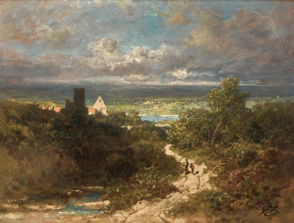 Curator: Charles-François Daubigny’s painting, "Entrance To The Village", presents a rustic scene executed with clear dedication to the effects of light and atmosphere. What are your initial impressions? Editor: The subdued palette certainly sets a peaceful mood. I am also drawn to the fact that the pastoral idylls are inhabited by people—what can we tell about their relations to this space, and how they impact or are impacted by its presentation as picturesque? Curator: I see the formal composition more literally. Observe the broad brushstrokes creating dynamic textures, most noticeably in the foliage and the thatched roofs. Note how Daubigny masterfully uses light to lead the eye. Editor: Right, but that painterly treatment itself needs interrogation. Landscape paintings have historically been entangled with issues of land ownership, labor, and class. The Romantic style here presents a potentially sanitized view of rural life. Curator: Are you suggesting this painting is making a claim to the depiction of a landscape "untouched?" Wouldn’t Daubigny's focus on capturing fleeting atmospheric conditions supersede the need for any symbolic representation of place? Editor: It’s a matter of perspective. How might this idealized depiction serve as a form of visual rhetoric that downplays the realities of agricultural labor or the socio-economic struggles faced by rural communities? Who would even own the landscape depicted here? Curator: But consider the technique! His impasto layers create a palpable sense of depth and texture, enlivening an otherwise conventional subject matter. One cannot deny its visual effect! Editor: And what *produces* that effect? The conscious decision to highlight the aesthetic qualities of rural scenery at a time when industrialization was transforming the social order… isn't that precisely the ideological work paintings like this perform? Curator: I appreciate the tension in our readings. We might just have to accept that Daubigny offers us a complex interplay of visual appeal and potentially romanticized content. Editor: Agreed. Understanding those contradictions, though, is precisely what makes this a compelling subject. It asks us to be critical of beauty and its inherent claims, historical positionality, and possible political valences.