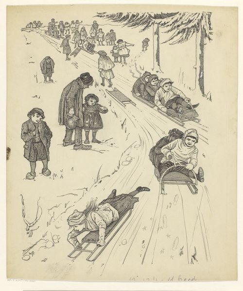 Curator: Gust van de Wall Perné created this drawing, "Drie jongens in de sneeuw," sometime between 1887 and 1911. It’s currently held here at the Rijksmuseum. Editor: It looks like a woodblock print, maybe? Stark, almost oppressive. The wintry scene with those spindly, bare trees creates a sense of isolation. I can practically feel the cold radiating from the paper. Curator: The artist actually employed ink on paper. This work aligns with the themes prevalent in genre painting, exploring the everyday experiences of these young boys. We should consider this work through the lens of children's labor, observing the means in which working class youngsters contribute. How does that sit with you? Editor: It’s interesting to consider these activities as labor, especially if the boys were obligated to clear paths. The visual evidence indicates children and winter, but how did Van de Wall Perné intend for these three boys to be viewed? Were their experiences elevated, simply acknowledged, or are we left to assume that such tasks comprised routine. The composition centers the actions. One is wielding a snow shovel while the other two focus on a sled. How does the materiality amplify this view of winter and obligation? Curator: That is an interesting entry-point! We could discuss the weight of obligation imposed upon children within the context of broader socio-economic pressures of the era. Considering the availability and affordability of drawing materials to working class families, do we know if they are intended to be viewed as representatives of a specific class. Editor: It would require researching the labor market around the period of artwork to understand how the artist utilized affordable materials and accessible forms to potentially provide some socio-economic and historical awareness to the work itself. Curator: Looking at the distribution and context in which these drawings would have been accessible could reveal much about how issues of identity and labour were conceptualized in relation to art and social action at the time. Editor: Yes, delving into the methods and meanings helps expose these dimensions to enrich our understanding. I'm interested to explore these relationships to potentially amplify their social narrative, too.