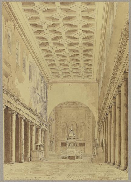 Curator: This engraving, dating to 1621, is by Domenico Parasacchi. It depicts the Catafalque for Cardinal Pietro Aldobrandini in Santa Maria sopra Minerva, Rome. It’s currently held at the Metropolitan Museum of Art. Editor: Immediately, I’m struck by the sheer linearity and depth of perspective. The repetition of vertical columns receding into the space is both calming and monumental. The values range from stark white to the dense stippling defining depth, resulting in overall graphic precision. Curator: Absolutely. The precise rendering of architectural space is crucial here. Consider the linear precision used to delineate every architectural detail. Each element—columns, arches, statues—is sharply articulated. Editor: Yes, it's like a stage set designed to impress. The catafalque itself is raised prominently at the end of the perspective lines, suggesting not just death but also the ascent of the Cardinal's spirit. There's an intense symbolic load in such theatrical presentation of death. Curator: Precisely. The catafalque in its time was a potent symbol of the family's continuing prestige. The symmetry and the strong horizontals—look at the base of the columns, how those echoes continue further into the drawing. It creates a sense of stately progression through this temporary monumentality. Editor: I note also the figures populating the scene. They’re not just fillers; their solemn assembly emphasizes ritual. They are a visual representation of the earthly church. Do you think the composition of the plate supports an allegory of spiritual attainment? Curator: It very well could. Remember the visual language in Italian Baroque. It combines naturalism with the era’s prevailing taste for magnificence, all employed to instruct and inspire. The image operates as both a memorial record and a means of social representation, reinforcing Aldobrandini's family legacy. Editor: And yet, stripped bare of the pageantry in graphic black and white, the drawing exposes an emptiness too—a void at the heart of this grand display. It’s an eloquent, sobering commentary on earthly power and mortal fate. Curator: Yes. Examining the architectural lines, observing the rhythmic repetition—ultimately lets us decode the period's mindset through Parasacchi’s vision. Editor: While contemplating the symbols and the visual narratives of this Baroque depiction, we become aware of both a celebration and a stark reminder of what endures beyond grandeur.