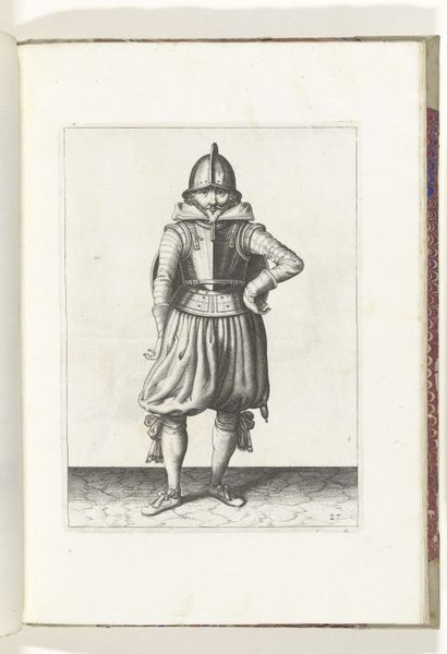 Curator: Let's turn our attention to "De exercitie met schild en spies: de soldaat houdt het schild met de linkerhand v\u00f3\u00f3r het lichaam (nr. 6)," an ink and paper drawing by Adam van Breen, created between 1616 and 1618. What strikes you about this image? Editor: There’s a quiet strength in this piece. It feels very matter-of-fact. Almost like a training manual page, but there's something more elegant, almost vulnerable in how the light touches his gear. I imagine him pausing for a brief second, wondering why he has to hold the shield like that again. Curator: Indeed. It's part of a larger series that showcases military exercises, meant to standardize training practices during a period of intense military reform and conflict. This particular pose would demonstrate a common defensive posture, shielding the body while preparing to strike with the spear. Editor: Ah, the banality of battle preparation! What resonates is the ordinariness of this image – how often we forget all the little steps of repetitive action involved when discussing historic battles. The meticulous details van Breen put in his clothes, especially those baggy pants – were they stylish at the time or standard military attire? Curator: A bit of both, I'd say. Clothing served a practical function, but sumptuary laws and social hierarchies also dictated attire, so there would have been variations based on rank and wealth. In a drawing like this, the rendering becomes as much about documentation as it is about social identity and hierarchy. Van Breen wasn't just documenting military positions; he was capturing the visual markers of social identity in that era. Editor: That's interesting; the man himself seems sort of generic, face obscured in shadow, but you're right; the attire almost places him. It brings up interesting questions on the artist’s intent. Curator: That’s right. These sorts of drawings are an invitation for the audience to observe closely how power was both embodied and performed within early modern society, which ties the micro of individual performance to the macro level of early modern geopolitics. Editor: Beautifully put. For me, it makes you think how heavy that shield probably felt and wonder what the soldier felt knowing that one move could be the one to keep you alive or not. It grounds the experience somehow. Curator: I agree. We can think about art in connection with social constructs, yet also on the level of personal humanity that touches us all. Editor: Indeed. Let’s leave our listeners to contemplate that intersection as they move along.