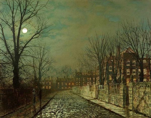 John Atkinson Grimshaw's 'Silvery Moonlight' captures a nocturne using oil on canvas to create a scene dominated by a subtle yet evocative palette of greys and muted yellows. The composition is structured by the stark contrast between the illuminated sky and the shadowy foreground, evoking a sense of quiet solitude. The artist’s technique here is to use contrasting textures, from the smooth, reflective wetness of the road to the rough, porous stone walls. The semiotic structure here relies on a manipulation of light and shadow. The moon serves not just as a light source but as a signifier of romantic beauty, an invitation to decode deeper meanings and feelings. The bare trees contribute to the sense of a barren, melancholic landscape. Ultimately, Grimshaw uses formal elements to create a dialogue between the visible and the felt, between the objective depiction of a scene and the subjective experience of encountering it. This artwork becomes a site where meaning is not fixed but fluid, shaped by our personal interpretations and emotional engagements.