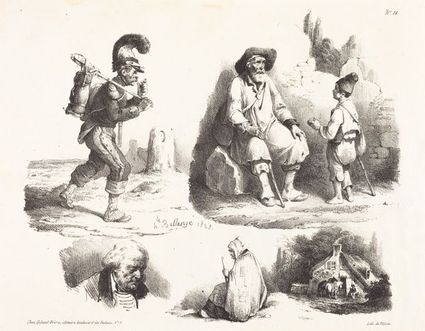 Curator: Rudolf von Alt's 1839 watercolor, "Galician Gypsies," immediately strikes me as quite tender, despite the obviously difficult circumstances it depicts. The muted colors contribute to this somber but delicate feeling. Editor: It is fascinating how Alt chooses to portray this community. The recurring motif of the draped cloth, almost shawl-like, acts as both clothing and a kind of protective armor. It definitely adds an element of vulnerability. The covering and uncovering becomes symbolic. Curator: Precisely. Observe how the woman in the center grounds the piece by facing forward, and appears to be clapping— a gesture that creates immediate dynamism. Her hands feel almost prayer-like. Editor: And notice that nearly everyone has their feet uncovered, emphasizing a rawness and connection to the land, while simultaneously alluding to their economic condition. There's a strong social commentary interwoven within this genre painting. Curator: It's also quite fascinating that von Alt, primarily known for his landscapes, would choose to focus on the figuration of a marginalized community. What could be the intended audience or the broader effect? Was the work meant to raise awareness, document a particular social stratum, or even exoticize these people? Editor: Alt positions these people within the Romantic movement of the 19th century. This is clear because it appears like an effort to depict 'authentic' peoples, while in doing so perhaps reinforces stereotypes that were held by Western societies during the time. Curator: These subtle aesthetic and symbolic nuances are intriguing. There's a tension between idealization and the reality of their lives which echoes sentiments within romanticism as well. We also should consider, the 'gypsy' figure as both the romantic 'outsider', and, in truth, the very real struggles these Romani people faced during this time. Editor: Right. It's a reminder that art is always a product of its time, reflecting not only the artist's vision, but also the prevailing attitudes and anxieties of society. Curator: Thank you for lending your sharp observations. These historical factors highlight just how multifaceted visual representations can be.