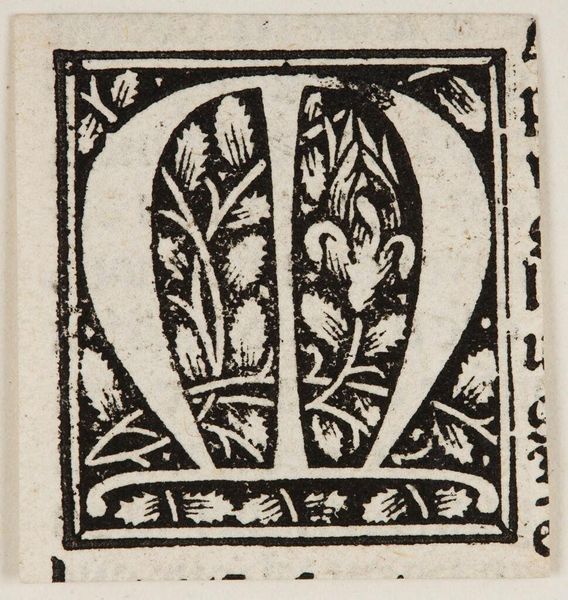Curator: This is “Letter V,” an anonymous artwork from the Harvard Art Museums. Editor: It has such a stark visual presence, a minimalist rendering softened by the botanical embellishments. Curator: Given the cultural context of illuminated manuscripts and early printing, it probably functioned as a decorative initial. The flowers and leaves could symbolize growth or literacy itself. Editor: The rigid geometry of the letter "V" provides a striking counterpoint to the fluid lines of the floral patterns. I read this tension as a visual analogy for the period's transitions. Curator: Perhaps, though it might also reflect the period's strict class-based constraints on literacy, with such stylized embellishments serving as visual reminders of social status. Editor: I see it now. The composition is much more about power and access than about botanical beauty. Curator: Exactly. It challenges us to consider whose voices were literally illuminated, and whose remained in the shadows.
