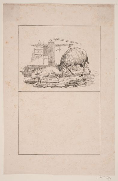 Johan Thomas Lundbye created this illustration using pen and ink. The artwork, titled "The Ram and the Pig," presents a dynamic composition rendered with fine lines, capturing a moment of confrontation. The texture of the ram's wool contrasts with the smoother skin of the pig, both set against a simple architectural backdrop. The composition is structured around the tension between the two animals. Lundbye’s use of line emphasizes movement, particularly in the ram’s poised attack and the pig’s evasive stance. The backdrop, though minimal, provides a spatial context, grounding the interaction. We can read this scene through the lens of semiotics, with the ram and pig acting as signs representing broader themes of conflict and survival. The ram, with its horns, signifies aggression and dominance, while the pig may symbolize vulnerability. This piece invites us to consider how art can function as a system of signs, communicating complex ideas through seemingly simple forms. By exploring the formal elements, we uncover layers of cultural and philosophical meaning embedded within the artwork, which is open to continuous re-evaluation.