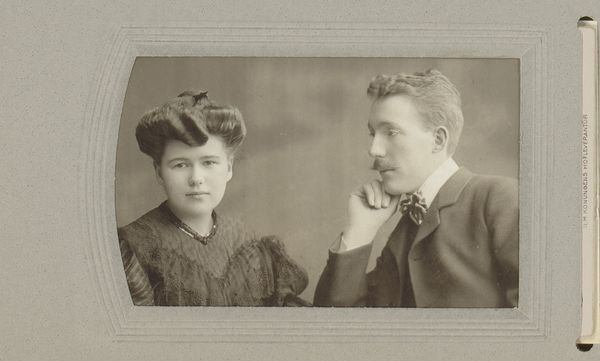 Editor: Here we have "Portrait of a Man and Woman," a photograph taken by A. van der Stok in 1914. The subdued tones and formal attire give it a sense of somber dignity. How do you interpret the symbolism embedded within this image? Curator: A fascinating question! I see a visual codification of societal roles and expectations. The man is positioned to the left, traditionally a place of honor, and his dark suit signifies authority. Yet, observe the woman's unconventional attire: a tie mirroring his, but paired with a more casual shirt. Doesn’t it signal a shifting dynamic, perhaps a subtle rebellion against the norm? Editor: That’s interesting. I hadn't considered the clothing as symbolic in that way, more as simply... of the period. Curator: Consider also the symmetry, the way they are almost mirror images. Photography freezes time, yet it captures so much more than physical resemblance. Doesn’t their positioning imply a certain solidarity, despite their divergent garments? This symmetry highlights equality while retaining signs of their assigned social standing in this particular moment. What underlying themes of identity and representation do you think van der Stok might have tried to reveal? Editor: It makes you wonder about their relationship. Perhaps a professional partnership alongside their personal one? Thank you; I see so much more depth here now! Curator: And hopefully understand the resonance of those images from the past that continue to speak.