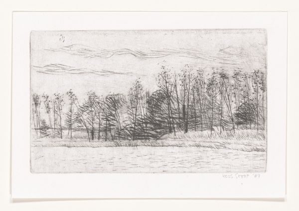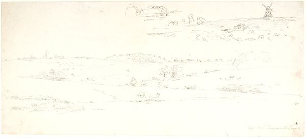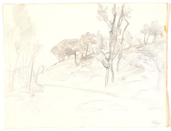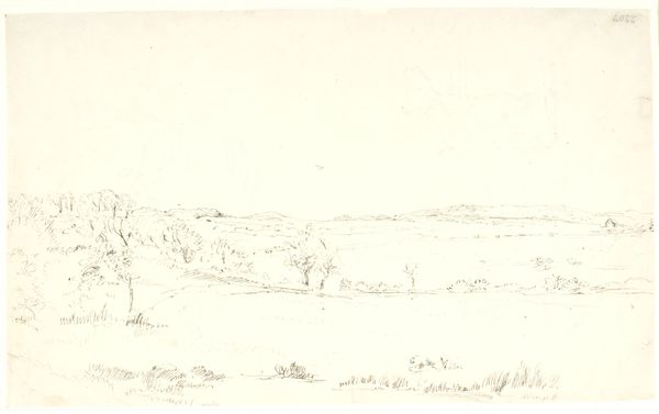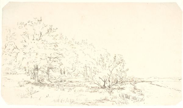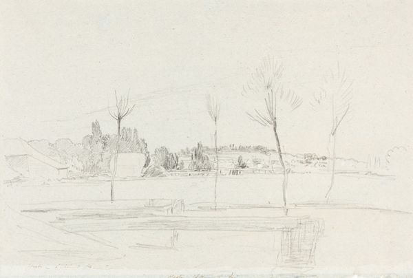Editor: Here we have C.A. Lorentzen’s, “Landscape with Two Trees in the Middle. To the right, the Gable of a House,” made sometime between 1746 and 1828. It looks to be a pencil drawing, almost an etching, a very spare image. What catches your eye in this landscape? Curator: For me, it's about understanding the landscape through its making. Consider the readily available materials: pencil, paper. A seemingly simple process, yet this ease belies a larger question: What were the conditions of artistic production during Lorentzen's time? Were these accessible materials reflective of a democratization of art, or simply a pragmatic choice dictated by economic realities? What does this piece suggest about labor and artistic value? Editor: That’s fascinating! I hadn’t considered the social impact of readily available materials. I was focused more on the romantic quality of the landscape. How would a materialist perspective change that? Curator: Well, the “romantic quality” as you put it, emerges precisely from this material context. The stark lines and bare composition might speak to the artist's own labor and perhaps, a subtle critique of idealized landscape painting popular at the time. This simple image prompts us to examine not just *what* is depicted, but *how* and *why*. How does Lorentzen's rendering challenge or reinforce notions of ownership and artistic status through his handling of simple materials? Editor: So, instead of seeing beauty, we're considering the means of production and the societal influences on the artwork's creation. It sounds like we need to shift our focus from aesthetic pleasure to analyzing labor, access, and value within a historical context. Curator: Precisely. By scrutinizing the materiality of art and understanding it as an industrial or post-industrial process we come face-to-face with production and its impact on how art is conceived, and by whom. Editor: This has really expanded my appreciation; I’m seeing more than just a drawing now! I never considered how access to materials might impact not only artistic creation, but its reception as well. Thank you!