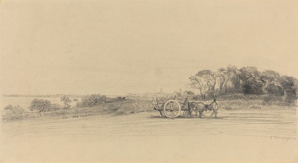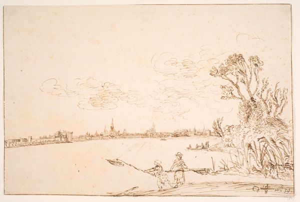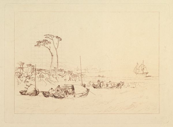 Editor: This is James Ensor's "Six's Bridge," created between 1885 and 1886, rendered in ink. It feels almost unfinished, a fleeting impression captured with very economical strokes. What strikes you most about it? Curator: Note how Ensor meticulously builds form through line alone. The density and layering near the tree and under the bridge give those areas a visual weight in opposition to the lighter strokes defining the distant boat. This carefully controlled tonal variation creates a satisfying visual harmony, don’t you agree? Editor: I do, but I almost wish he had added more detail. I find myself wanting a clearer sense of depth. Curator: But isn’t that the appeal? Ensor doesn’t give us everything; instead, the piece engages the viewer to co-create the landscape. The sketch is complete precisely because it is unfinished; additional marks would resolve tensions deliberately left unresolved. Consider the empty space—the negative space is crucial to the overall composition and contributes just as much to the articulation of the scene as any of the ink work. Editor: That's a great point. I hadn't considered the importance of what’s *not* there in creating balance. Curator: The spatial relations that Ensor builds between objects contributes a great deal to our experience, don't you think? How do the horizontal pilings across the bridge relate to the mast and rigging of the sailboats further out in the scene? Editor: Now I see it. The work feels much more dynamic by creating contrast between these horizontal and vertical forms that carry our vision. Curator: Indeed, through Ensor's carefully placed markings, a complex spatial geometry opens itself up to us, inviting our contemplation and close inspection. Editor: I see how limiting our focus strictly to the formal components of line and spatial play brings out subtleties I would've otherwise missed. Curator: Precisely. Close formal analysis opens channels to understanding.