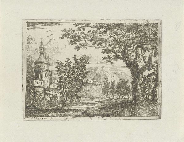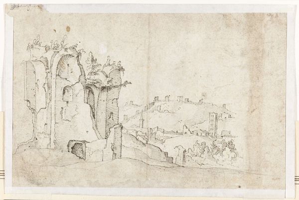 This is a 16th-century etching by the artist known only as Monogrammist DB, presenting a sweeping landscape punctuated by classical ruins. The composition, rendered entirely in delicate lines, invites you into a world where nature and classical architecture merge. Observe how the artist uses linear perspective to lead your eye from the foreground—defined by the intricate lines detailing the natural elements—back to the distant city. The ruins scattered across the middle ground are not merely architectural remnants, but structural elements that divide and organize the pictorial space. The etcher's lines delineate not just form but also texture, enriching the visual experience. The artist's interplay between organic and geometric forms—the wildness of nature versus the rigid structures of classical buildings—destabilizes the typical landscape conventions. The lines serve not only to depict but to question how we perceive and categorize space. What emerges is a landscape that challenges fixed meanings, inviting you to interpret the relationship between nature and culture.
