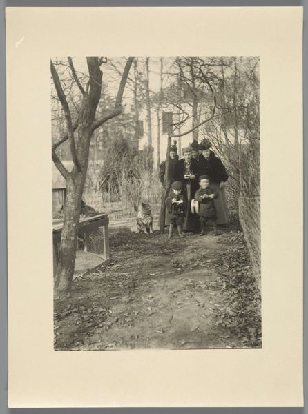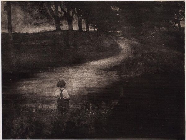 Editor: This gelatin silver print, "Two women walking in park--People," was created by Robert Frank sometime between 1941 and 1945. It evokes a quiet and somewhat melancholic feeling in me. What do you see in this piece, focusing on its form and construction? Curator: Structurally, the composition is divided roughly into thirds, both horizontally and vertically. Note the deliberate placement of the women in the lower left quadrant, leading the eye diagonally toward the light patch in the center, and the darker area in the right. The grayscale palette minimizes distractions. What is the effect of that? Editor: I see what you mean, the shading is what drives the focal point. Using so little colour actually allows the landscape to feel more intricate. Do you find the absence of detail in the figures themselves distracting? Curator: Not at all. Their anonymity is a calculated decision, an intrinsic part of the photographic narrative. We know that in Robert Frank’s body of work, these themes represent a recurring motif. It allows us, the viewer, to focus on the interaction between light and shadow, texture and form, without the imposition of individual personalities. Note also the rule of thirds and balanced negative space used by Frank to lead the eye throughout. Do you see how light and form are related here? Editor: It seems that form, for Frank, directly impacts our ability to actually notice light. Curator: Precisely. Editor: That's an astute observation that really changes how I appreciate the work's deeper meanings.