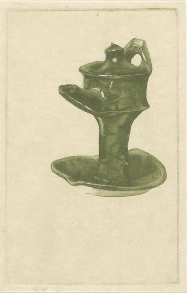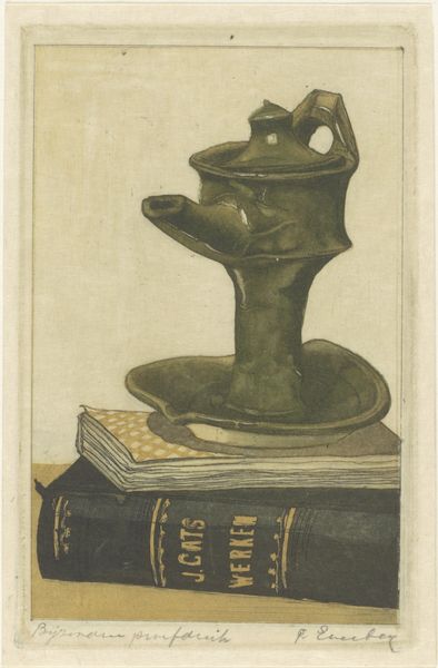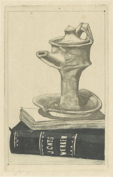 Editor: This is Frans Everbag's "Stilleven met schenkkan en boeken," potentially from 1914. It's a pencil drawing, and the paper has aged, giving it a toned effect. It has such a quiet, contemplative mood. What do you see in this piece, considering its historical context? Curator: The choice of a still life in 1914 is interesting, especially given the backdrop of impending war and social upheaval. I wonder if the artist uses this genre to suggest a retreat into the domestic and intellectual sphere, or if the “stillness” itself is meant to convey something more complex? Editor: That's interesting. A retreat? The pitcher seems precariously balanced on the books. Could that imply a fragility in this retreat? Curator: Precisely. It provokes questions about who had access to these spaces of intellectual retreat, and the political implications that might carry. What kinds of narratives were excluded when these still lifes were made, and how does this choice reflect broader power structures? The books themselves could be considered symbols of power. What do you think about that? Editor: I see your point. It's not just a simple, quiet scene. The choice of objects, and the time it was created, speaks to a larger societal context about who had the privilege to create art, read, and reflect in a world changing so rapidly. Curator: Exactly. Thinking about the gender and class dimensions, for instance, really opens up the dialogue. It's more than just a beautiful drawing; it's a snapshot of a very particular moment. Editor: I'll never look at another still life the same way. Thank you. Curator: And I’m glad we could bring contemporary discussions around intersectionality to bear on art from over a century ago!