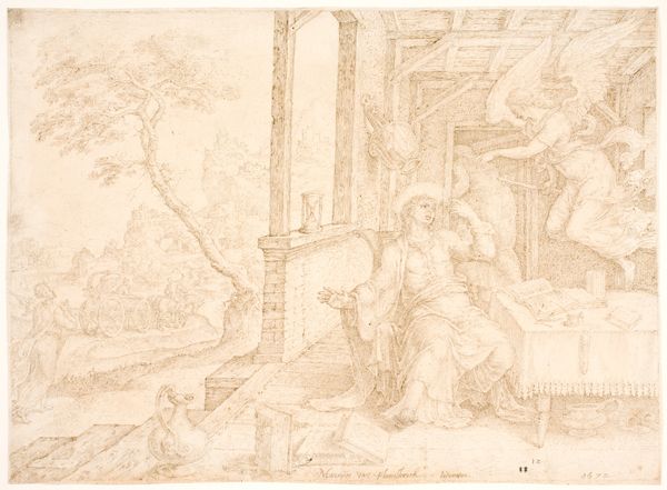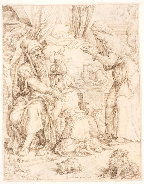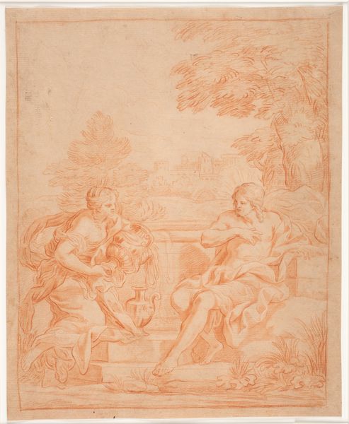 Curator: Looking at this preliminary drawing titled "Supper at Emmaus," an academic work by Nicolas Bertin, the red chalk practically vibrates on the paper. It’s full of energy! Editor: Yes, the looseness of the sketch really conveys that immediacy, the moment of recognition in the biblical story. It is also impossible to look at this composition and ignore the legacy of patriarchy inherent in the staging of Christ's final supper—even in a study such as this. Curator: Note how Bertin uses broad strokes for the figures' robes, really showcasing his mastery over the chalk medium to convey light and shadow so efficiently. It speaks volumes about the academic system that he trained within. This isn't just religious devotion; it's skill. Editor: Absolutely, but consider the religious iconography within that framework, where the distribution of labor and access were, themselves, socially codified through both secular and divine laws. Who had access to religious stories and the resources to produce art interpreting them? Who did not? Curator: The artist certainly had access! I imagine the paper, chalk, the very act of preparing for a larger history painting—these raw materials are not simple to acquire. Also note the controlled composition. We can trace, from pieces like this, how students learned proportion and design. Editor: Agreed. And examining it further reveals that, beyond the immediate impression, access defines not just its production but also its interpretation. Consider how women may experience narratives so inherently patriarchal... How can those in marginalized positions interpret that original story through Bertin’s representation, layered through these artistic materials, historical setting, and choices. Curator: This kind of prepatory study showcases art not as an inspired stroke, but skilled labor with carefully selected material. We must acknowledge what Bertin knew about material and academic markets of his time. It's important when understanding production! Editor: Precisely, it demands we also critically address the inherent power dynamics shaping these visual traditions—a perspective vital in understanding and contextualizing our encounters with pieces such as Bertin’s academic approach to 'Supper at Emmaus.' Curator: Right, so in essence, even a study in chalk becomes evidence of both devotion and skilled training... Editor: And demands an interrogation of the systems within which "Supper at Emmaus"—as both study and story—was born.