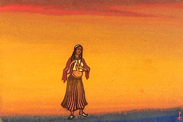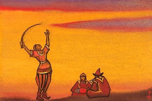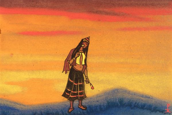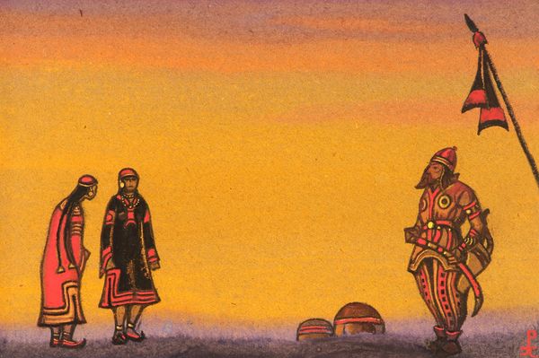 Nicholas Roerich made "Polovets with bow" and I’m struck by the way he's laid down these warm sunset colors. It feels like a backdrop for a stage, doesn’t it? Like the beginning of an opera or something. What I love about this piece is the simplicity, the rawness of the application. Look closely, you can almost feel the hand of the artist moving across the surface. The figures, they’re not trying to be perfectly realistic, but they have this incredible presence. It reminds me that art doesn't have to be about flawless representation; it can be about feeling, about capturing a moment or a mood. Roerich was a theosophist and his later paintings took on a spiritual quality, but his earlier works feel more grounded, more like historical scene-setting. It makes me think of the stage designs of someone like Leon Bakst – it's a similar conversation about history and identity. And like Bakst, Roerich reminds us that art is often about an ongoing conversation, ideas bouncing off each other across time. There's something so freeing about that ambiguity, isn't there?