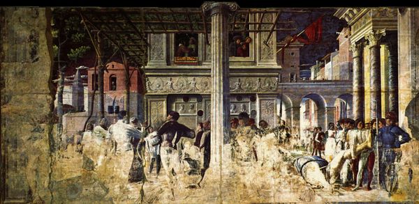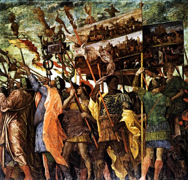 Editor: This is Carl Spitzweg's "Arrival in Seeshaupt," painted around 1880 using oil on canvas. It depicts a bustling scene in a small town. What strikes me most is the sense of joyful chaos—everyone seems to be going somewhere! What do you see in this piece? Curator: Beyond the immediate charm, I see a visual record of a culture grappling with modernity. Consider the railway, only partially visible. The "arrival" signifies not just people, but also new ideas, technologies, and social norms entering a previously insulated world. Editor: That's a fascinating point. The train is almost secondary, yet its presence is powerful. The figures, with their varying attire and activities, feel very much a part of the Romanticism movement. Curator: Precisely! The individual, often yearning for a simpler past, stands in contrast to the incoming locomotive. What emotional narrative do you read from the colors used? Editor: There is something subtly melancholic amidst the bright colors. Almost a tension between celebration and uncertainty. It almost asks, "At what cost?" Curator: You're touching on something key here. Spitzweg, through his intimate scenes, explored how technology was affecting human relationships, a sentiment reflected by many artists during the time. How interesting. Editor: I'm left wondering, if Spitzweg was alive today, what symbols of progress would he feature in his art to trigger that same blend of emotions? Thank you. Curator: And thank you for the reminder that art history lives as long as the symbolic narratives remain alive, changing over time.