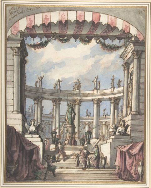 Editor: Here we have an 18th-century watercolor titled *Gezicht op de Colonnade in de Tuin van Versailles*, housed here at the Rijksmuseum, and created by an anonymous artist. It depicts the Colonnade at Versailles with many figures enjoying the garden. I’m struck by the rigid formality of the architecture juxtaposed with the relaxed atmosphere of the people in the garden. How do you see this piece fitting into its historical context? Curator: The painting certainly reflects the period's obsession with control and order, manifested through its architecture. But look closely at how the garden is presented - it’s more than just an aesthetic choice. Gardens like Versailles were potent symbols of royal power and dominance. The arrangement, symmetry, and even the control of nature were meant to communicate authority. Editor: So, you are saying that the way Versailles gardens are conceived says something about the cultural meaning of royal power. In that light, why do you think the artist populated it with figures that seem to act naturally? Curator: Exactly. In terms of these small figures enjoying the space, notice their postures and interactions. What could those suggest about the intended audience of such a display of power? Editor: That the power can be shared, at least symbolically. Like, these grounds exist for all. Curator: Precisely. And what do you suppose about how the location of Versailles itself, situated outside Paris, reinforced Louis XIV’s socio-political agenda? Editor: The King controlled all of his subjects and cut ties to political struggles of Paris, using his garden and palace to do so. Curator: Right. So we might view the artist as subtly commenting on or reinforcing these notions through their art. The seemingly simple portrayal of a garden becomes laden with meanings about control, access, and social hierarchy. Thanks! It really changes the way I will visit Versailles.