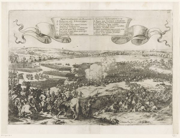 Curator: Before us, we have "Slag bij Gembloers, 1578," an engraving created between 1643 and 1645 by Frans van den Wijngaerde. It currently resides here at the Rijksmuseum. The battle scene seems…intricate, chaotic even. Editor: Yes, a sprawling tapestry of tiny figures. The sheer number of bodies gives it a restless energy, doesn't it? I can almost feel the density of the event, rendered visible through the layering and detail. It feels quite overwhelming to take it all in. Curator: Precisely. Wijngaerde's technique relies heavily on line, doesn't it? Look at the crosshatching creating tonal depth, almost sculpting form, giving the viewer a bird’s-eye perspective. There’s very little illusionistic depth beyond that though; instead, we have a conceptual, map-like rendering. Editor: And a deliberately chosen perspective. Considering this print likely served a commemorative or propagandistic function, what does it tell us about how war was manufactured for consumption back then? We are viewing from a position of control and understanding. The labor of creating all these minute marks adds meaning. This print was likely made with multiple steps, perhaps etching, engraving, and potentially other methods. Curator: The strategic organization in its design is meant to translate specific virtues: clarity, order, discipline. But it’s hard to ignore how Wijngaerde uses a Baroque sensibility—layering of detail for a grand visual experience. This kind of approach heightens drama and underscores the weight of historical narrative. Editor: Still, the materiality cannot be divorced from its historical purpose. We can question, for example, who had access to such an image? How did these images function within a developing visual culture of war reportage and commemorative prints? Curator: Excellent questions. Analyzing from both perspectives brings richness. Wijngaerde's composition has the formal qualities of landscape with the density of history painting! It creates, even across centuries, a striking tension in its subject matter. Editor: Indeed. Viewing this print through the lens of material analysis illuminates production, audience, and its purpose in shaping perspectives during periods of conflict and beyond.
