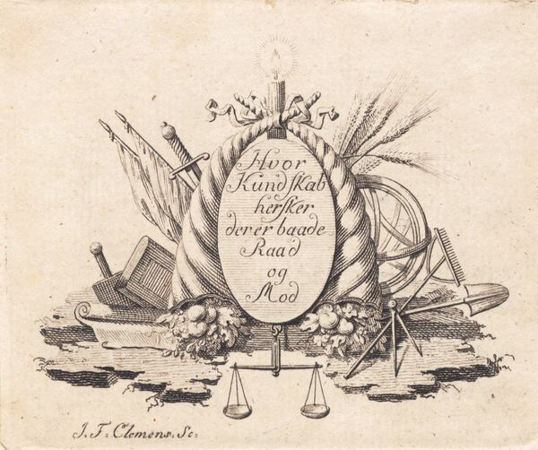 This small copperplate print was made by Meno Haas in the 18th century. The technique involves incising an image into a metal plate, inking the surface, and then wiping it clean so that ink remains only in the recesses. Paper is then pressed onto the plate, transferring the image. The crisp lines and fine details speak to the engraver’s skill, but the design is even more revealing. It’s an allegory of knowledge, with the Danish inscription "Where knowledge reigns, there is both counsel and courage." Surrounding the central inscription are symbols of wisdom and virtue – scales of justice, a burning candle, and tools associated with skilled trades. The print rewarded long hours of labor on Haas' part, like that of the artisans whose work is referenced in the composition. It served a purpose, communicating Enlightenment ideals to a broad audience. And although small in scale, it represents the massive shifts in social and intellectual life underway at the time. In this respect, it serves as a reminder that even the humblest objects can reflect larger historical forces.