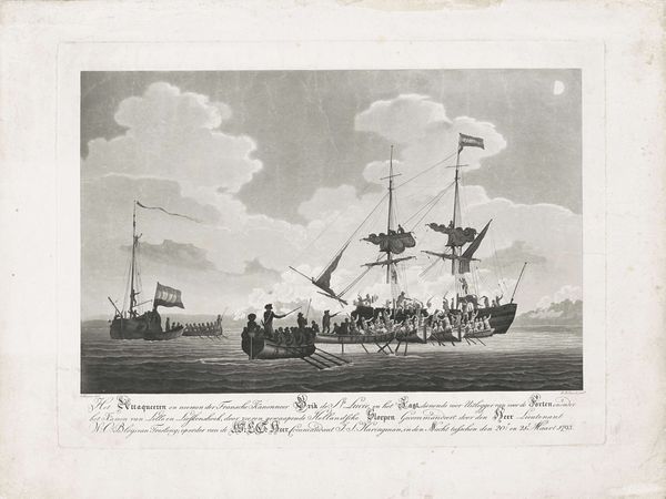 Curator: Here we have Hippolyte Bellangé's "Heldenmoed van generaal Grouchy in de slag bij Waver, 1815," a print combining etching and engraving, made between 1817 and 1819. What are your initial impressions? Editor: Chaos. That’s the first word that comes to mind. It’s all frenetic energy and angled bodies. You can almost hear the shouts and the gunfire even in this static scene. The lighting seems almost…theatrical? Curator: Indeed. Bellangé, working in the Romantic style, captures a key historical narrative moment rife with the ideological tensions of the post-Napoleonic era. Consider the figure of Grouchy, elevated on horseback: how does this imagery intersect with the socio-political context of military leadership and national identity? Editor: The horse itself is an interesting symbol. Usually, it’s about power, nobility, the higher calling. But this one seems almost…frightened. Its stance is tense, unrooted, as if mirroring the uncertainty of the battle itself. And what about the drum in the foreground? Curator: A potent reminder of loss, surely. Its presence on the ground near fallen soldiers introduces themes of mortality and the fragility of human life amidst conflict. It adds a layer of criticism of war. The drum as a pre-battle symbol now defeated along with the bodies brings forth the emotional burden. Editor: The positioning of Grouchy seems key too. He’s directing the action but separated, almost floating above the fray. Is he meant to be the ideal leader or a figure disconnected from the reality faced by his men? Curator: A provocative question. Perhaps Bellangé aims for ambiguity, leaving viewers to grapple with the complexities of heroism, sacrifice, and leadership during a period of intense social and political upheaval. Considering its function as a print intended for wider distribution, one wonders about its role in shaping public opinion regarding Napoleon's legacy. Editor: Absolutely. This print is not just a depiction of a battle. It serves as a poignant visual document rife with the burdens of war and glory of its leaders, all while reminding of what lies below both: common suffering. Curator: A sobering thought to leave us with as we move to the next work. Thank you for your insights.