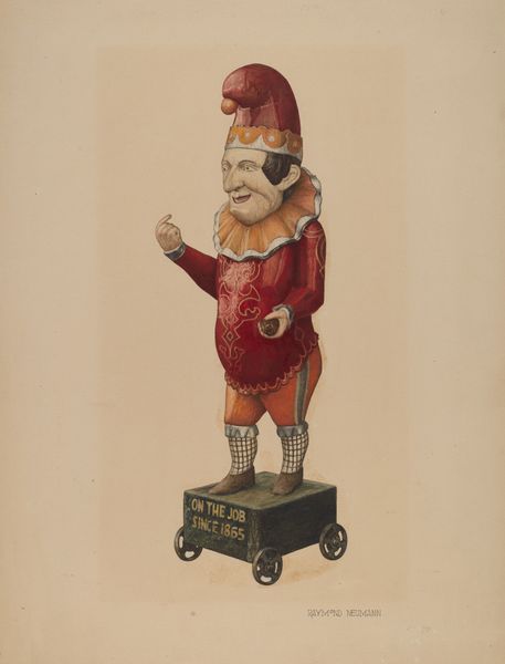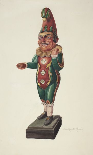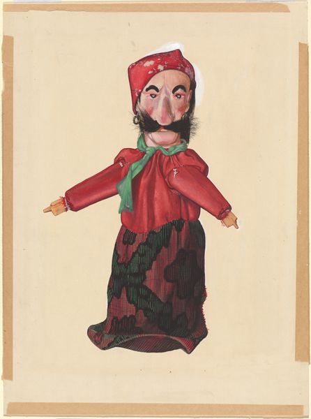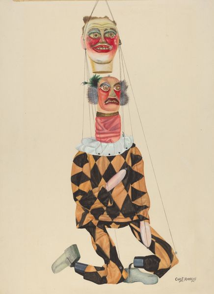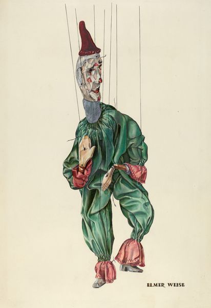 Elmer Weise made this watercolor drawing of a King Saul marionette sometime in the twentieth century. It's fascinating to consider this image in the context of social commentary, particularly how it reflects on power and control. Weise's choice of King Saul, a biblical figure known for his troubled reign, suggests a critical perspective on leadership. The marionette itself, with its strings visibly attached, becomes a potent symbol of manipulation. Is Weise commenting on the way leaders are often puppets of larger forces, controlled by external influences? The exaggerated features and theatrical costume add to this sense of artifice, hinting at the constructed nature of authority. Understanding Weise's work requires us to delve into the social and political landscape of his time. Through research into the history of puppetry and its use in satire, alongside an investigation into the artist's life and influences, we can uncover the layers of meaning embedded in this seemingly simple image. The interpretation of art is always contingent on its social and institutional context.