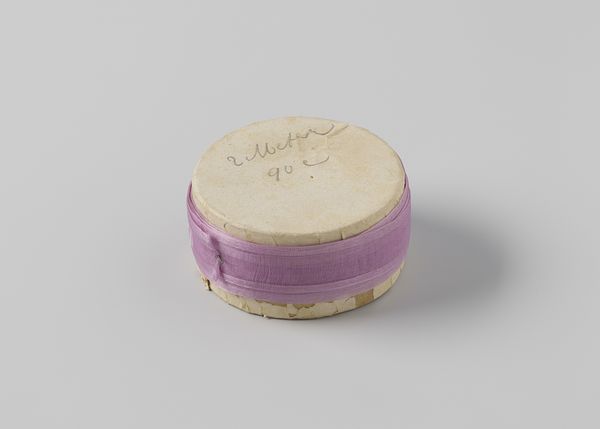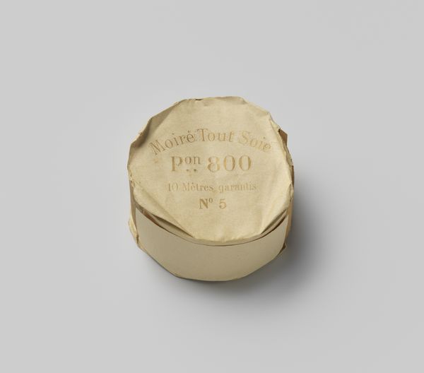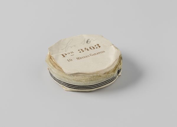 Curator: The Rijksmuseum holds this intriguing still life from around 1925, "Roll of Cream-Colored Silk Satin Ribbon." Editor: My initial impression is of humble luxury. It's a simple roll of ribbon, yet the silk satin hints at high-end craft. It's quite muted and dignified for a product shot. Curator: Precisely. Considering the date, this was likely created as advertising. Note the handwritten annotation on top; "5 meter" with “Pon 12 meter" printed below suggesting options in available lengths. Editor: Fascinating. I see the utilitarian aspect clearly, but also a level of deliberate presentation. How would it have been used in its original context? Curator: One could imagine it in fashion magazines, trade catalogues... Places where textiles and their applications were featured to promote sales. What’s important is this bridging of the world of commercial production and the staged image. It’s blurring lines we’ve long segregated. Editor: Yes, and how the very notion of 'craft' intersects with this nascent advertising industry! Silk satin involved specialized labor and processes. It’s not just the end result of luxury, but also the material implications of its creation and availability that interest me. Curator: I am reminded about who the consumers were, then. Who sought to acquire such adornments. How their purchasing power shaped the market and gave artists a whole new clientele, even opportunities to explore product design. It becomes this interesting cultural web of consumption and creativity. Editor: It challenges the notion of the artist in their isolated studio. These sorts of images put creative people right in the gears of consumer culture, with tangible social and economic consequences for their livelihoods. Curator: Absolutely. And viewing it through the lens of both material and historical context reveals the socio-political influences on art itself, questioning the divide between commerce and art. Editor: This careful arrangement and capture elevates a roll of fabric to more than just a commodity; it hints at the desires, industries, and power dynamics interwoven within even such seemingly mundane objects. Curator: Indeed. Looking closer, we perceive something unexpectedly meaningful; an artifact which connects craft with economy, culture, and advertising strategies. Editor: A great reminder to appreciate the broader tapestry woven from artistry, commercial endeavor, and materials science!
