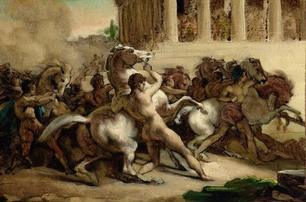 Editor: So here we have Théodore Géricault's "Riderless Racers at Rome" from 1817, done in oil paint. My first impression is a sort of controlled chaos—you've got the wild energy of the horses and the crowd juxtaposed with what looks like a very structured space. What do you see in this piece? Curator: Chaos elegantly framed, wouldn't you say? For me, this painting bursts with the nervous energy of the Romantic era. Géricault captures that fascination with primal emotion, that tension between order and unbridled instinct. You see these riderless horses, manes flying, eyes wide – almost mirroring the emotional turbulence of the time. And it's interesting, isn't it, how he places the spectators, the civilised world, just above the frenzied action, almost voyeuristic? Does that framing device suggest something to you? Editor: Maybe a comment on society's relationship with its more…untamed impulses? Almost like they're observing something they can't quite control? Curator: Precisely. This Agony and the Ecstasy narrative reflects the Romantic spirit. There’s something profoundly honest in admitting this. He isn’t afraid to show these competing human drives! So we have a thrillingly complex human drama. What do you make of the subdued, almost melancholic color palette against such a spirited subject? Editor: I guess that adds to the overall feeling of tension – it's not a bright, celebratory scene, more like a raw, visceral experience. Something deeper than mere spectacle. I had never thought about it this way, very interesting! Curator: Well, these horses continue to carry the riders within our own selves in perpetuity.