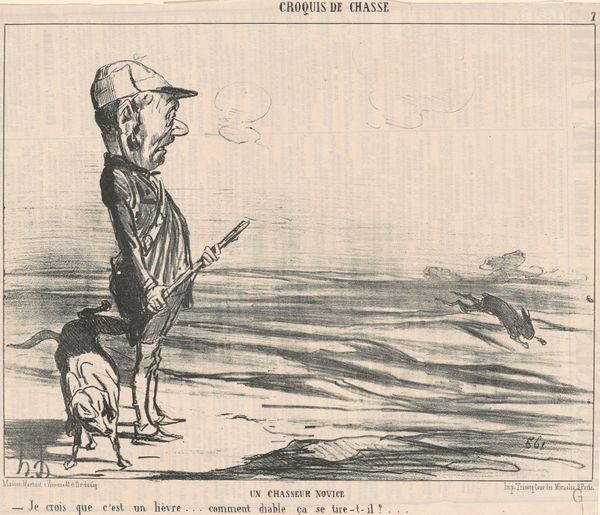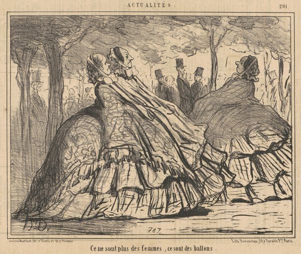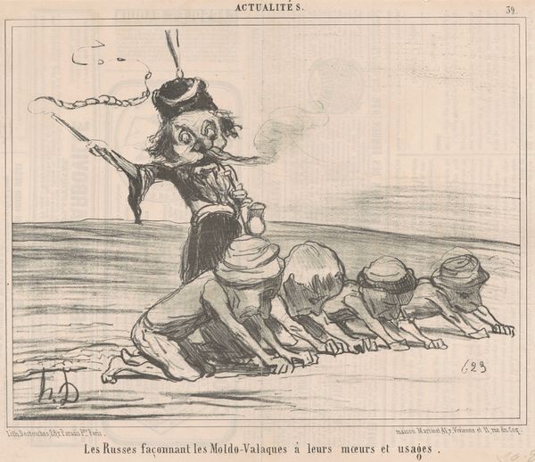 Curator: Look at this, the bitterness practically jumps off the page! Editor: Indeed. We are looking at "Les boyards réduits à cultiver ...", which roughly translates to "The Boyards Reduced to Cultivating..." a lithograph print created circa 19th century by Honoré Daumier. It is quite scathing, isn't it? Curator: Oh, it sings with discontent! Daumier's hatching work gives the piece so much gloom, almost scratches it onto you. It feels as relentless as tilling a field, really. What do you think, from a compositional view? Editor: The composition is very clever, actually. See how the figures in the back all hunch forward pulling the plow, a picture of exhausted labour, receding into the background like a drawn out conclusion. Whereas the boyard is foregrounded with his grim, distorted features. Curator: A perfect encapsulation of societal upheaval! Editor: Precisely. There’s a visual rhythm in the repeating curves of their backs contrasting to the sharp angles and intense concentration in the single figure's face, which accentuates his new plight in sharp and somewhat unyielding detail. And consider that horizon, too; not at eye-level, or perhaps our sympathies might shift somewhat, but high up almost cutting him off, a bleak feature to suggest that the nobility have been left out in the cold! Curator: Poor dears. *Wink* Though to me it also shouts a certain cyclical fate –those who forget history are doomed to repeat it, or till it, in this case! The material itself aids it further. The harsh black lines of lithography feel unforgiving, much like societal judgment. It feels more than realism: It's emotional reportage! Editor: That resonates, certainly. Daumier uses a relatively constrained palette to evoke a very direct social criticism here, blending artistry with political comment very adroitly, creating, finally, an accessible yet pointed portrayal of forced social reform. Curator: Art with a vengeance then. A sort of graphic agitprop... fascinating stuff. Editor: An exemplary conclusion to Daumier’s work, then; thank you!