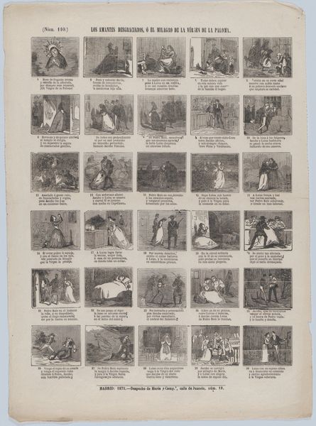 José María Marés created this broadside of lithographic prints depicting memorable events in Spain until 1840. Popular prints like this one served a vital public function in 19th century Spain, disseminating cultural and political information to a broad audience. Here we see forty-eight scenes arranged in neat rows. They visualize a narrative of Spanish history. The images, though small, create meaning through their visual codes, referencing key historical events, figures, and cultural symbols. Spain in the 19th century was undergoing significant political upheaval. The broadside can be seen as an effort to define and solidify a national identity during a time of great change. Publishers like Marés played a key role in shaping public opinion through the distribution of such imagery. Further research into the specific historical context of each scene would help to understand its original meaning and significance. Examining the archives of the Marés publishing house might reveal more about its role in shaping popular culture and political discourse in Spain.