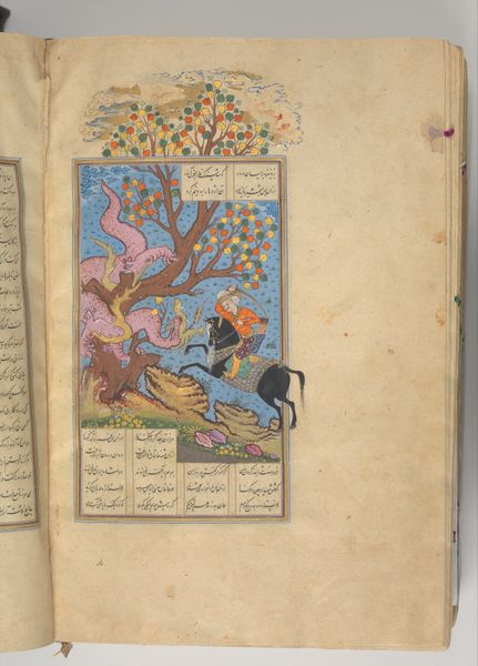 Editor: This is "Prince Khusrau Arriving at Shirin’s Castle," a watercolor and ink miniature from around the late 15th century. The prince on horseback looks up towards a woman in a tower—the scene feels quite dreamlike and theatrical. How do you interpret this work? Curator: I see a powerful intersection of longing and visual narrative, wouldn't you agree? Consider how the window, and Shirin framed within it, becomes a potent symbol of desire and unattainable beauty, recalling traditional artistic conventions. Is the miniature style reflective of a deeper societal memory, a visual echo? Editor: It definitely gives the impression of a cherished story being carefully preserved, passed down through generations. The detail, especially on the prince's garments and the horse, is really striking. Curator: Indeed. The detail is meticulously rendered. More than that, think of the horse itself! The symbolism in this imagery can tell a broader story than one of courtly love and yearning; the horse embodies both power and vulnerability of man. Doesn't that alter your initial take somewhat? Editor: It does add a new dimension. I was initially focused on the romantic aspect, but seeing it in terms of broader cultural symbolism is fascinating. Curator: Precisely! Remember, these visual choices were rarely arbitrary; they reflect a collective cultural consciousness at work, adding new depth to our understanding of a 15th-century Persian love story. What would you take away from it? Editor: I see now how every element in this miniature plays a part in telling a complex, culturally rich story that speaks across time. Thank you for the iconographic lens! Curator: My pleasure! It's rewarding to witness how such visual memories ignite understanding across centuries.