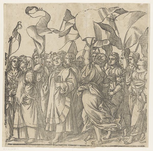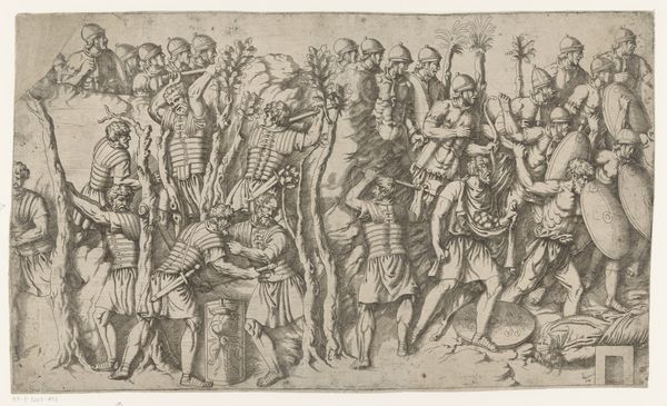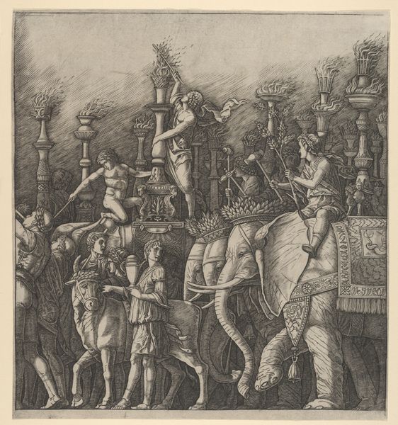 Curator: Before us, we have "Triumph of Caesar: Soldiers Carrying Trophies," dating back to around 1495. It's currently held here at The Art Institute of Chicago. What are your initial thoughts? Editor: There's a striking linearity and detail. It almost feels like a stage design, meticulously planned with layered depth despite its monochrome nature. It strikes me as quite monumental, yet rendered with such fragile lines. Curator: The work really dives into the themes of military processions, the glorification of conquest, and, naturally, classical antiquity. But focusing on the materiality: it is an engraving. The meticulous process involved in creating such detail is quite astonishing. Editor: Indeed. Note how the artist uses varied line weights and densities to create the illusion of shadow and depth. Look at the burnishing of the armor, how its polished quality is conveyed purely through contrast and strategically placed linear elements. This reveals an obsession with form and structure—almost mathematically rendered. Curator: It also raises questions about the labor involved. Consider the workshop conditions, the apprenticeship system. What about the social status of the engravers involved? Were they recognized artisans or anonymous laborers replicating classical ideals for a burgeoning Renaissance market? Editor: An excellent point. And I wonder about the specific iconography chosen for those trophies. Each shield, each vessel, meticulously rendered; are they symbols that were deeply significant at the time, readily understood cultural touchstones for contemporary viewers, now largely lost to us? Curator: Exactly! And it invites a consideration of the patron or commissioner, someone clearly interested in linking themselves to the grandeur of Roman triumph, using this very accessible print to enhance their cultural standing and participate in the circulation of prestige. Editor: We have touched on the power of form, structure, and linear contrast—to communicate volumes. Curator: Yes. But we also considered the socio-economic structure that was supporting the making of the very piece of art, a crucial part of its own Triumph.