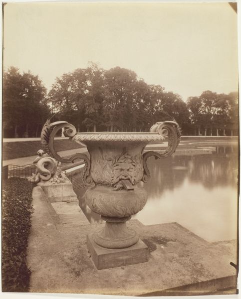 Curator: This gelatin silver print, titled "Versailles, Vase par Ballin", was created in 1902 by Eugène Atget. Editor: It has this incredibly muted palette that just softens everything, lending an almost dreamlike quality to the garden scene. There is a very strong focal point given by the placement of the ornate vase on the lower central section of the composition. Curator: Absolutely. The vase itself, situated prominently, serves as a symbol of cultivated nature, doesn’t it? Versailles, after all, was intended as an assertion of control, a visual embodiment of royal power over the natural world. Atget often focused his lens on elements that spoke of a specific era and its social structures. Editor: But consider how the texture of the vase interacts with the less defined, almost blurred background. It’s a beautiful tension. The rigid geometry of the vase against the diffused greenery – an exploration of contrasting forms. I mean, just consider the relationship between positive and negative space. Curator: I'm interested in the flowers bursting forth from the vase. They are spilling, exceeding the rigid confines of the man-made structure. Is there an evocation here, perhaps, of a wildness that always threatens to reclaim the manicured landscape? The image hints at a fragility underlying the artificial perfection that was being asserted in the French gardens. Editor: Possibly. Or could it be simply Atget responding to a pre-existing geometry? I appreciate the tonal gradation; the photograph presents the movement of the light. It allows us to see the composition with such subtlety. The print surface itself seems almost luminous. Curator: It's fascinating to consider Atget's project as a kind of visual preservation. He sought to capture these relics of a specific time and place before they disappeared, holding memory in these tangible images. Editor: Looking closely at the silver print itself—the materiality contributes enormously. The delicate balance is achieved only with light, form, and the artist's hand. The image really exists at the edge of something else. Curator: Well, I leave with the impression that, beneath its formal qualities, the photograph also reflects the power structures in place in early 20th century French society. Editor: And I remain fascinated by its visual construction, the play of texture, light, and form that really makes it captivating.