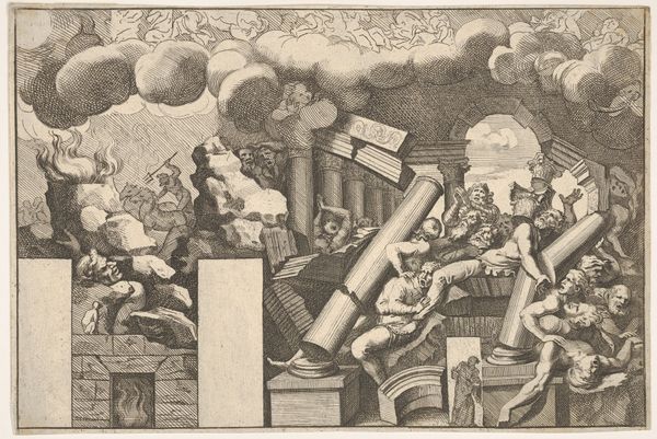 Curator: Ah, here we have "The Stone Operation or The Witch of Mallegem," a 1559 engraving attributed to Pieter van der Heyden, currently residing at The Art Institute of Chicago. The detail is astounding, isn’t it? Editor: Chaos, pure unadulterated chaos! It’s like a Bosch painting gone mad with ink. The feeling is... intensely busy, a swirling carnival of anxieties, all captured on paper. Curator: The work’s creation—engraving on paper—is key, I think, to its accessibility at the time. Prints like these allowed for widespread dissemination of social commentary, reaching audiences far beyond the elite. Think about the labour involved: meticulous carving into a metal plate, repeated printings, each a miniature act of production. Editor: Exactly! And this commentary… it bites! Look at the 'surgeon' extracting a "stone" from the patient's head. It speaks to the anxieties around charlatanism and the commodification of health. Selling false hope; always a money maker. Curator: A commentary perhaps on human gullibility, the desire for quick fixes. And it feels incredibly timeless, even today. The clothing and setting are 16th century, but the sentiment? Echoes loudly. Editor: Tell me about it! It's easy to forget this all springs from tangible things: metal, ink, paper… mundane materials, yet look at the emotional weight they carry, how far that labor goes in shifting opinions and capturing beliefs. I’m curious, what do you make of the bizarre imagery in the background? A sort of madhouse spilling out across a village… Curator: For me it adds another dimension of playful unease. Truth is not clearly separated from folly. Sanity and insanity blur… maybe we all have that “stone” in our heads. The piece refuses to let you feel comfortable dismissing these characters. We are them, or perhaps we might become them. Editor: Well, for me this image exposes so many social issues rooted in base materialism: medical quackery as commerce, collective gullibility as a consumer trend… But for you it feels more intimate, existential… Curator: Indeed. I get a bittersweet sense of understanding our shared human flaws, etched onto paper. An artifact of human experience. Editor: Yes and produced, bought, and sold and widely distributed: art made accessible. Something truly worth studying and understanding about it, I feel.
