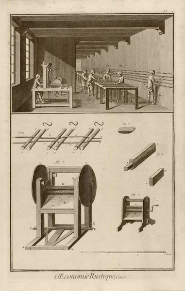 Editor: This engraving, titled "Atelier waar waaiers worden gemaakt," or "Workshop for Making Fans," by A.J. Defehrt, was created sometime between 1751 and 1772. It feels very orderly and detailed, showing the various stages of fan creation. What do you see in this piece? Curator: What immediately strikes me is the representation of labor, and particularly gendered labor. We see primarily women engaged in the craft of fan making. Consider the social and economic context. Who were these women? What were their lives like? Were they paid fairly? How did this work relate to societal expectations of women during that time? Editor: That's interesting, I hadn't really thought about the gender dynamics at play. So the image isn't just about the fans themselves? Curator: Exactly. Look at the lower half of the engraving. The shapes and tools are meticulously laid out. Is it merely documentation of technique? Or perhaps is it a subtle commentary on the division of labor inherent in craft production? The clean, organized depiction contrasts sharply with the reality of many workshops, where labor conditions were often far from ideal. It is important to analyze the power dynamics. Editor: So by looking at the historical and social context, we can read deeper meanings into what might seem like a simple depiction of a workshop? Curator: Precisely. We can start to unpack how this image reinforces or perhaps even subtly challenges societal norms and power structures of its time. Art is rarely neutral. Editor: This has given me a completely different perspective on the artwork. Thanks, this was a fascinating angle to consider. Curator: My pleasure! There are many ways to interpret and examine this artwork and other works from this time. Remember, the artwork exists because it reveals the larger conversations in which society engages.