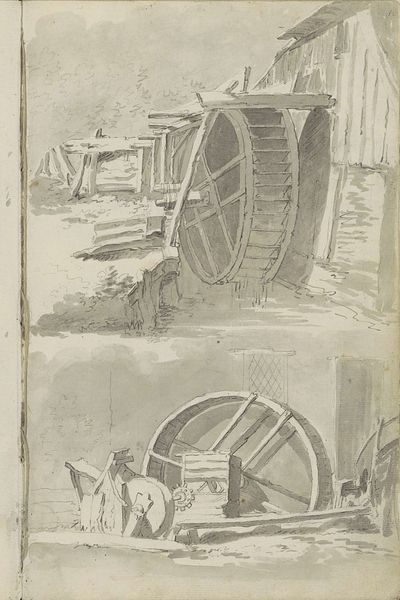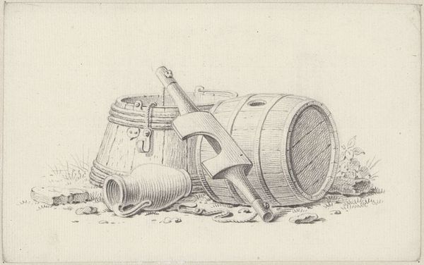 Pieter de Goeje made this drawing of a still life with a butter barrel and tub with pen in gray ink. The forms seem humble, yet they yield a wealth of information when we consider how lines articulate volume and spatial relationships. The composition presents a careful arrangement of everyday objects, where each component, from the barrel to the tub, is rendered with meticulous detail. De Goeje's attention to the structure of the objects transforms these mundane items into a complex interplay of forms. The tub and barrel are not merely containers but are rendered as geometric figures in space. The artist emphasizes the curvature of the barrel, contrasting it with the angularity of the tub, creating a visual rhythm. The texture is suggested through the hatching and cross-hatching, bringing a tactile quality to the otherwise flat surface. The drawing offers an exploration of form and function, inviting us to reconsider the beauty inherent in simplicity.