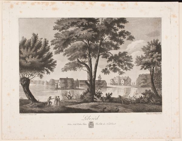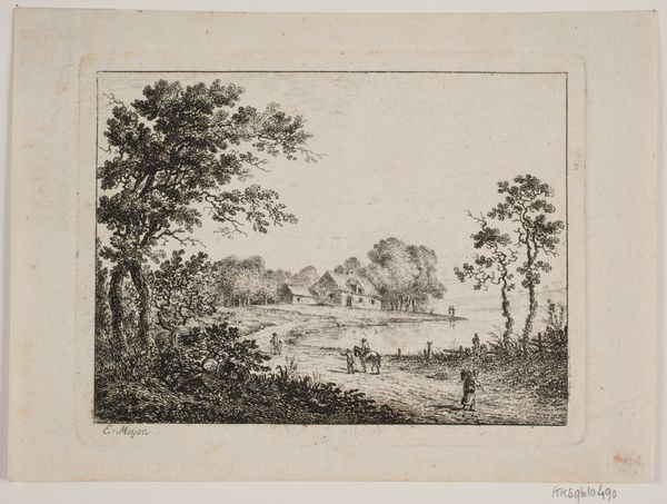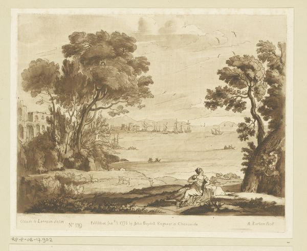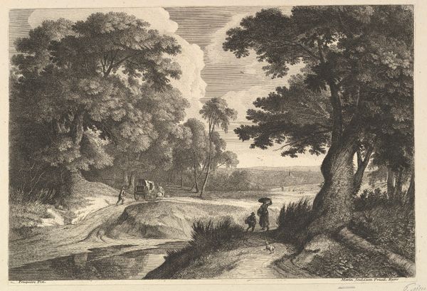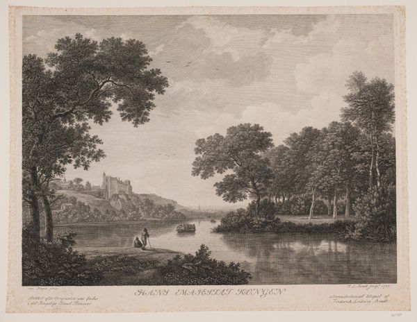 This is Frederik Ludvig Bradt’s “Prospect of the Area near Fredensborg Seen from Sørup,” an engraving offering a glimpse into the Danish landscape and its cultural values. Created by Bradt, who was working in a Denmark marked by Enlightenment ideals and social hierarchies, this landscape isn't just a pretty view; it’s a statement about ownership, control, and the romanticized vision of nature. The serene composition, featuring grazing deer, embodies an idealized vision of rural life, reflecting the values of the elite who had the leisure to appreciate such scenes. Consider how class distinctions are subtly embedded within the work, as the untamed wilderness is carefully framed and curated for aesthetic consumption. How does Bradt invite the viewer to reflect on the relationship between humanity and the natural world? Does it perpetuate or challenge the narratives of its time?