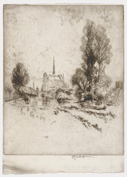 Editor: This is "Nigg Church, No. 2," an etching made in 1910 by James McBey. It’s incredibly detailed; I’m fascinated by the intricate line work. How do we unpack such a visually rich print? Curator: We must consider the labor embedded in the etching process itself. The painstaking work with acid and metal, the physical act of pressing the print. What does that repetitive action signify? Editor: You mean, is McBey making a statement by using a process with a rich history? Curator: Precisely! Etching was, and still is, a laborious craft. In 1910, there was a rising market for prints; they were cheaper and easier to reproduce than paintings, putting art within reach of the emerging middle class. How might the rise of the market influence McBey? Editor: He’s using an established technique to reproduce an image more affordably and make it available for mass consumption? I suppose that challenges our notion of the artist as solely focused on original creations. It’s mass production. Curator: Consider how his choice of subject matter--a church, deeply rooted in place and tradition—engages with that market. Who was his intended audience, and how would they interact with this image of "Nigg Church"? What elements like landscape play into the experience and ownership of a McBey's creation? Editor: So, instead of focusing solely on McBey's artistic vision, we’re thinking about the role the work plays in its specific moment. It’s more about how it circulates than the artist’s touch? Curator: Both are essential! The artist's choice of material and process dictates access and determines who consumes his art, and how. McBey's artistry intersects with commerce and cultural consumption in profound ways. Editor: This definitely gives me a completely fresh perspective on this print. I wouldn’t have thought of the social implications behind what seemed to be just a landscape of a church.