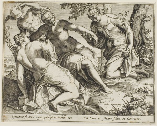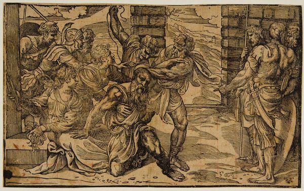 Editor: This is Nicolò Boldrini’s "Samson Taken By the Philistines." I’m struck by the intense drama packed into this relatively small block print. What catches your eye in terms of the formal elements at play? Curator: Note the artist’s strategic use of line. Observe how the density of hatching and cross-hatching not only defines form but also dictates the visual tempo. The clustered, agitated lines around Samson contrast sharply with the calmer landscape. Editor: So the busyness emphasizes the struggle? Curator: Precisely. The composition also directs our gaze. The figures form a dynamic, almost pyramidal shape, focusing attention on Samson's capture. How does the artist’s choice of medium affect your reading of the image? Editor: It feels raw and immediate, maybe due to the stark contrast and the lack of color. I see that the medium really adds to the drama. Curator: Indeed. Boldrini masterfully uses the limitations of the block print to amplify the scene's emotional power. A powerful example of form enhancing content. Editor: I hadn't considered how much the printmaking process contributes to the story’s emotional impact. Thanks for pointing out the interplay of form and narrative.